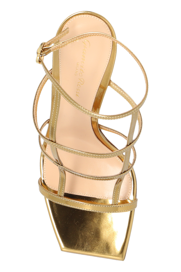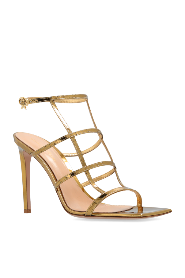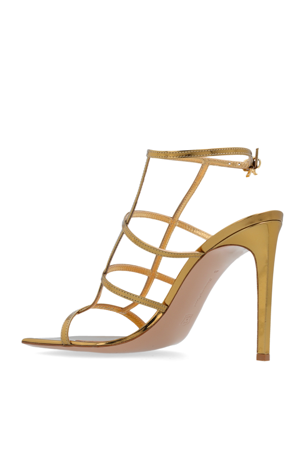Introducing the Mondry heeled sandals from the exclusive Gianvito Rossi collection. These exceptional sandals, made from the highest quality leather, captivate with their luxurious appearance. Material: The shiny, gold material gives them a distinctive character, while the thin yet sturdy straps and classic stiletto heel elongate the silhouette and add elegance. Details: The ankle strap with a small buckle provides adjustment and stability, and the designer's logo subtly placed on the inner insole adds prestige. The square toe front is a trendy element that emphasizes modern design. Why should you buy this product? The gold color adds sparkle to any outfit. Made from the highest quality leather. Elegant, high heel accentuating the feminine silhouette. Details such as the ankle strap and designer logo. Trendy square toe front.