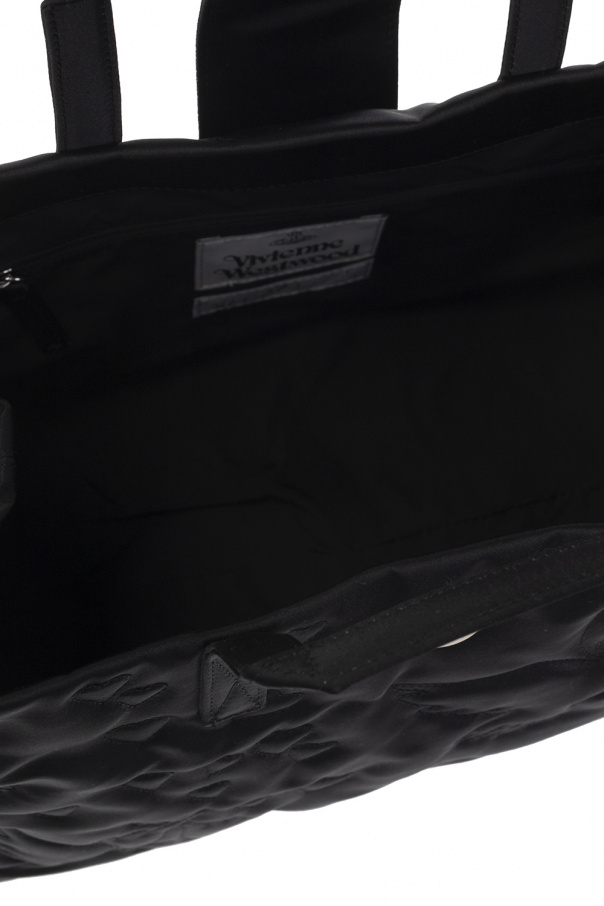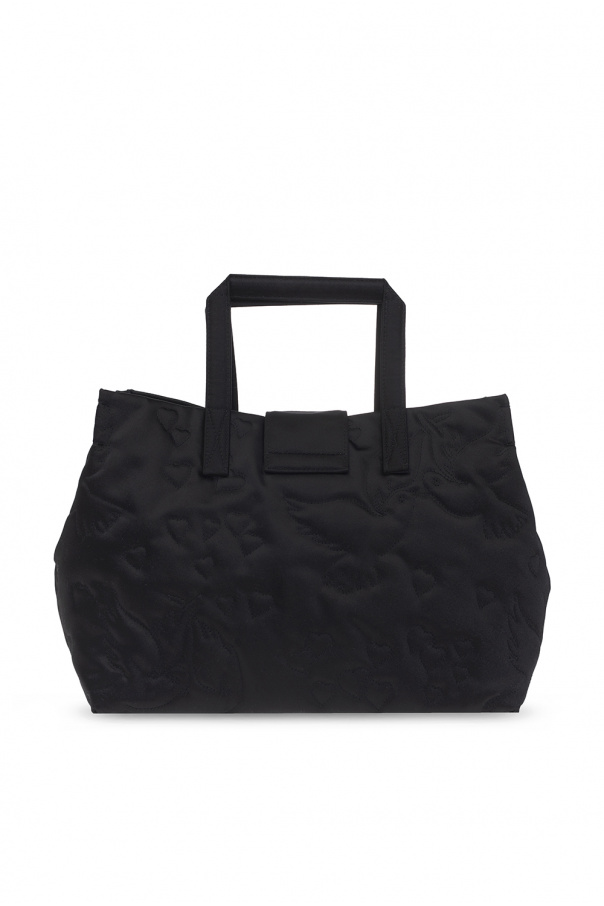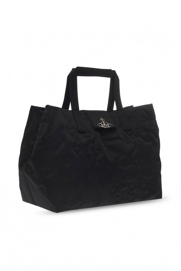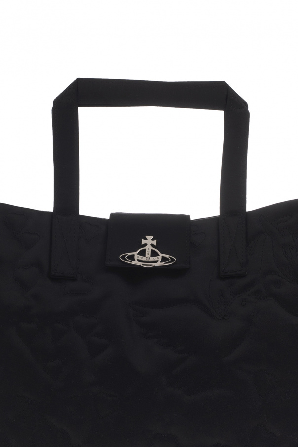 Black ‘Brigitte Medium’ handbag from Vivienne Westwood. Crafted from recycled satin, this design features a magnetic stud closure with a distinctive logo plaque, the label's ‘Love Birds’ embroidery, two half-round handles, silver-tone metal hardware and one internal compartment with one slip pocket and one zip pocket. 100% vegan product.