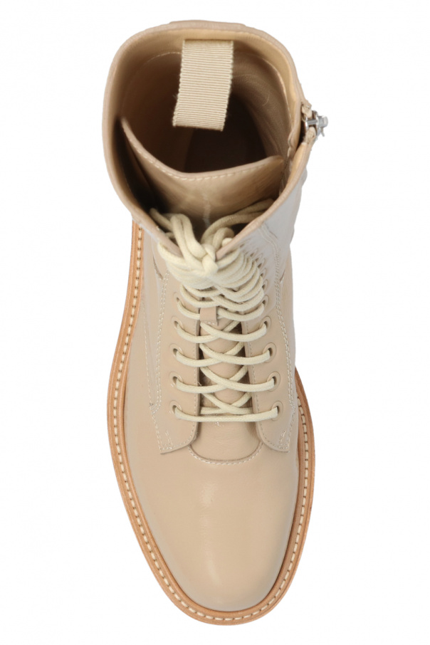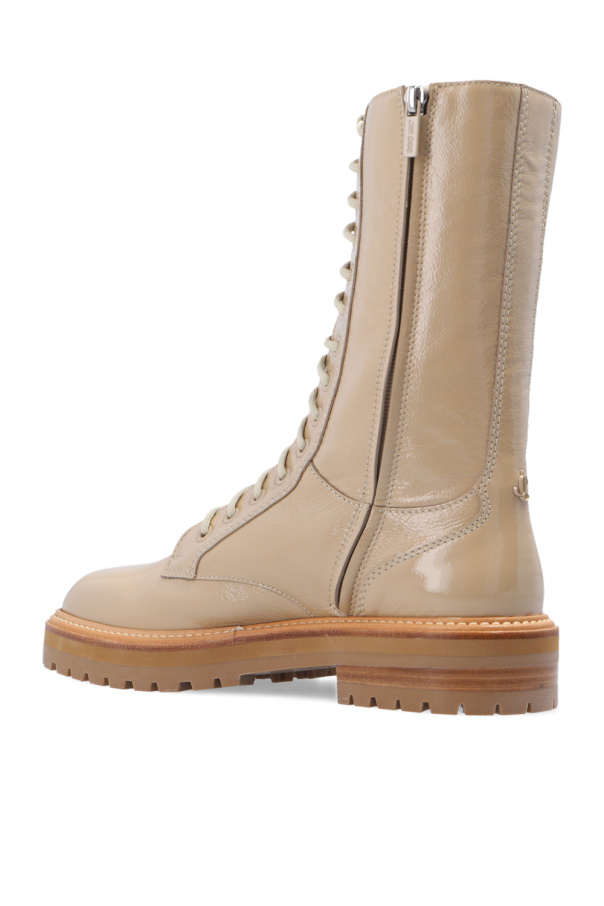 Light beige ‘Cora’ boots from Jimmy Choo. Made of patent leather, this pair features a side zip and beige rubber sole.