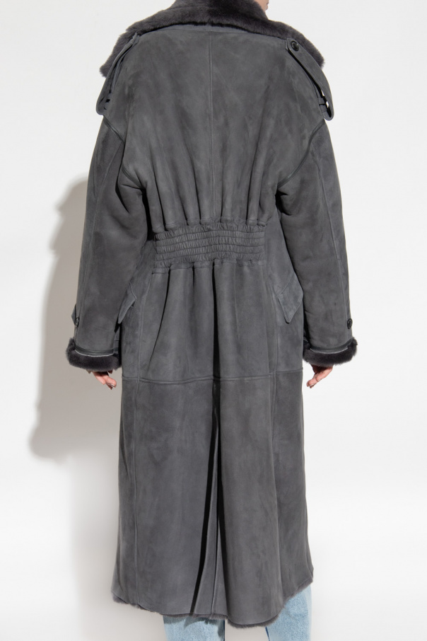 Dark grey ‘Jordan’ shearling coat from The Mannei. Crafted from sheep leather with a suede trim, this style features a long, oversize silhouette, a double-breasted button fastening, a back elastic trim, shoulder epaulettes, fur trimming on the collar and sleeves, two flapped pockets and a single back vent.