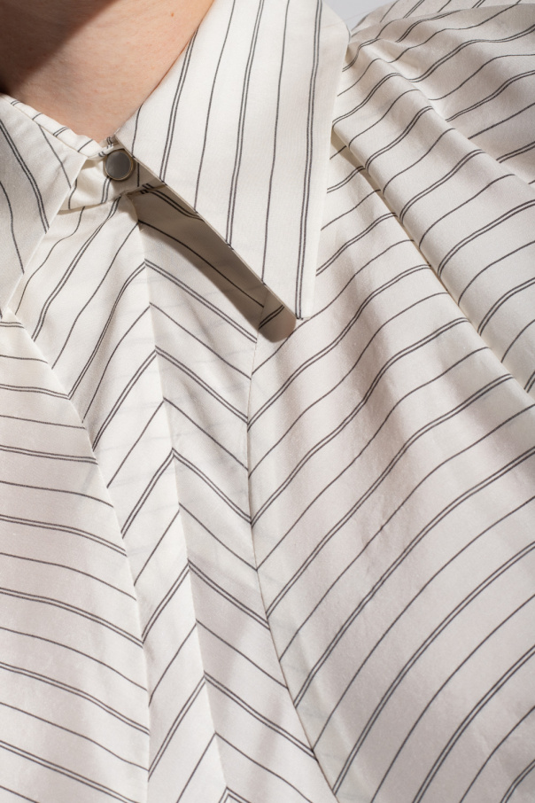 Cream ‘Eori’ top from Isabel Marant. Fastened with a back zip and hook, this pair features a snap closure on the front, dark grey pattern and 3/4 length puff sleeves.