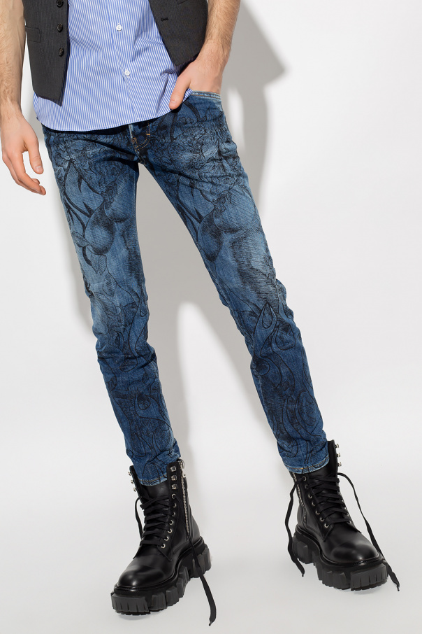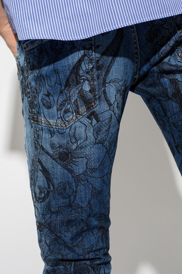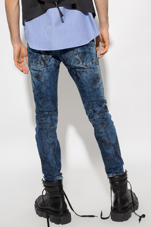 Blue ‘Skater’ jeans from Dsquared2. Crafted from cotton, this pair falls with tapered legs and features button fastenings, classic five pockets and a black floral print.