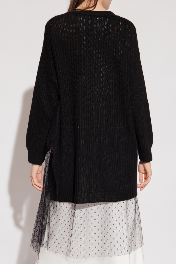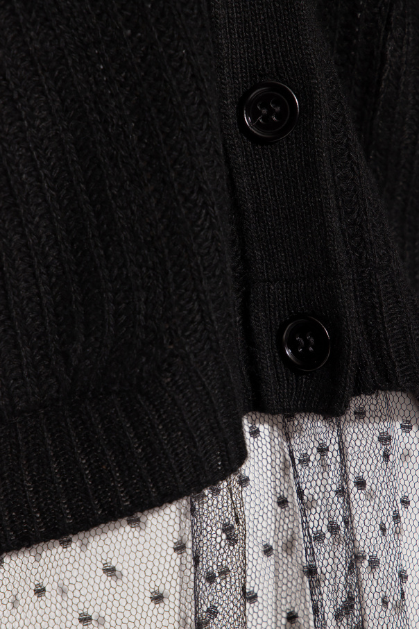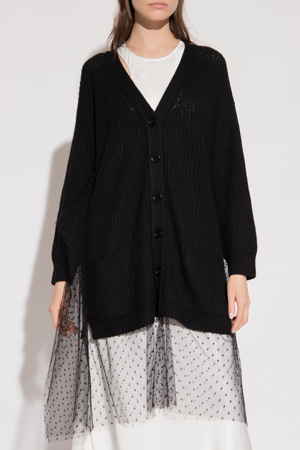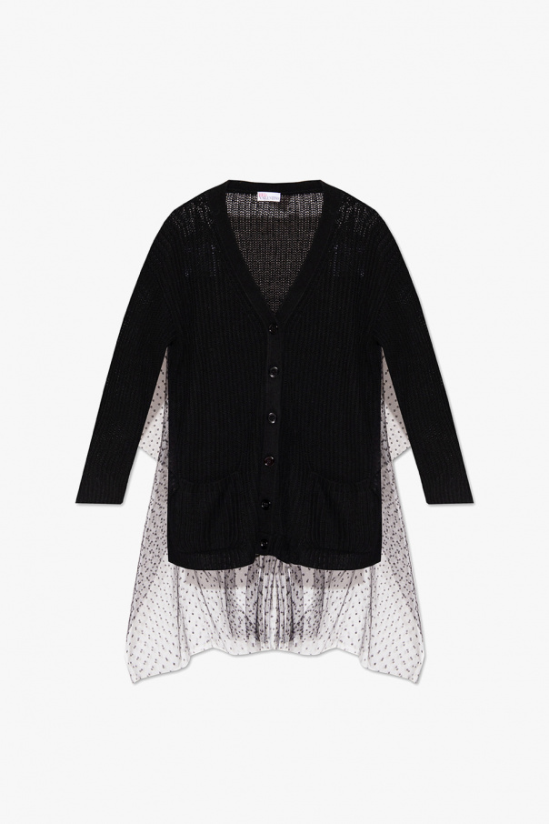 Black cardigan from Red Valentino. Fastened with buttons, this V-neck design is complete with two slip pockets, the label’s signature tulle trims and ribbed trims at the hem and cuffs.