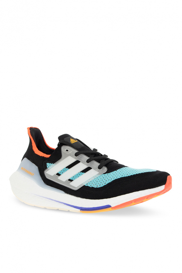 Black, light blue and neon orange ‘UltraBOOST 21’ sneakers from ADIDAS Performance, the ‘Primeblue’ line. Featuring a Primeknit+ upper, this lace-up pair features an orange logo appliqué on the tongue, the iconic three stripes on the sides and a white, blue and orange Stretchweb Continental™ rubber sole with 6% more Boost capsules and the new Torsion System, which provides a 15% increase in forefoot bending stiffness for a more responsive run. Primeblue is a performance fabric made with Parley Ocean Plastic, which is created from recycled plastic waste intercepted from beaches and coastal communities before it reaches the oceans. Products made of Primeblue contain a minimum of 40% recycled material in total.