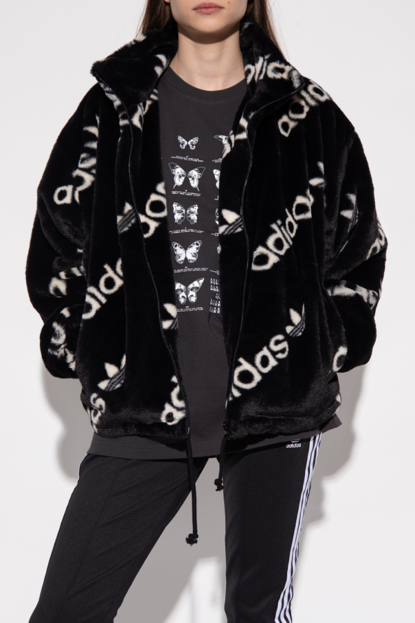 Black jacket with a standing collar from ADIDAS Originals. Crafted from recycled faux-fur, this style features a zip fastening, white logo detailing, two zipped pockets, long sleeves with elasticated cuffs and a drawcord-adjustable hem.