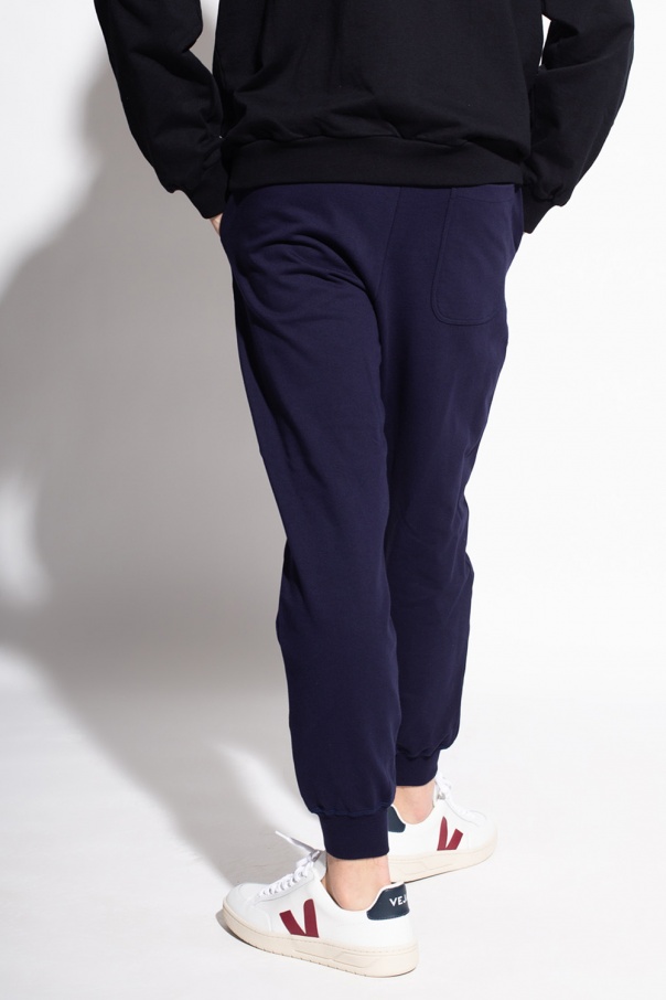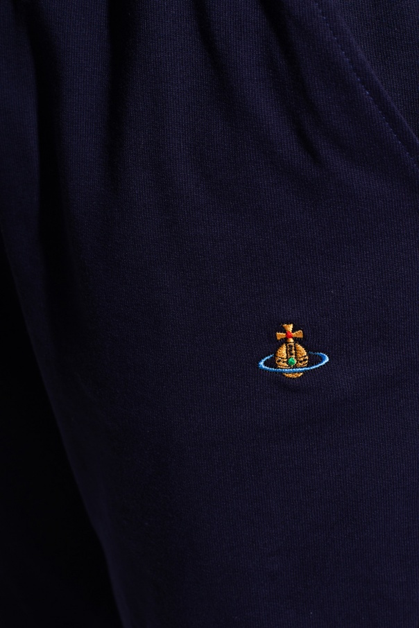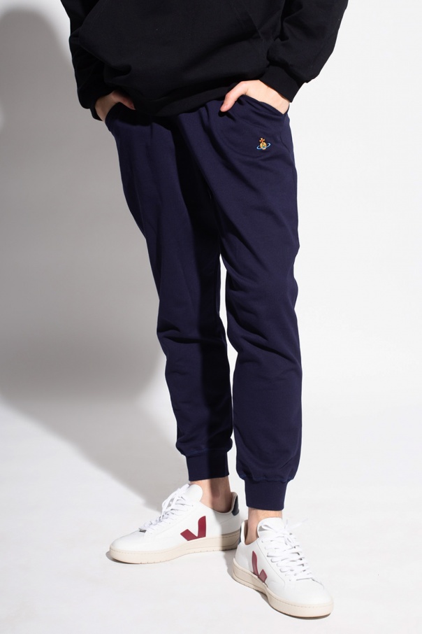Navy sweatpants from Vivienne Westwood. Made of cotton, this design is complete with a drawstring waist, multicolored logo embroidery, two front pockets, one back pocket and elasticated cuffs.