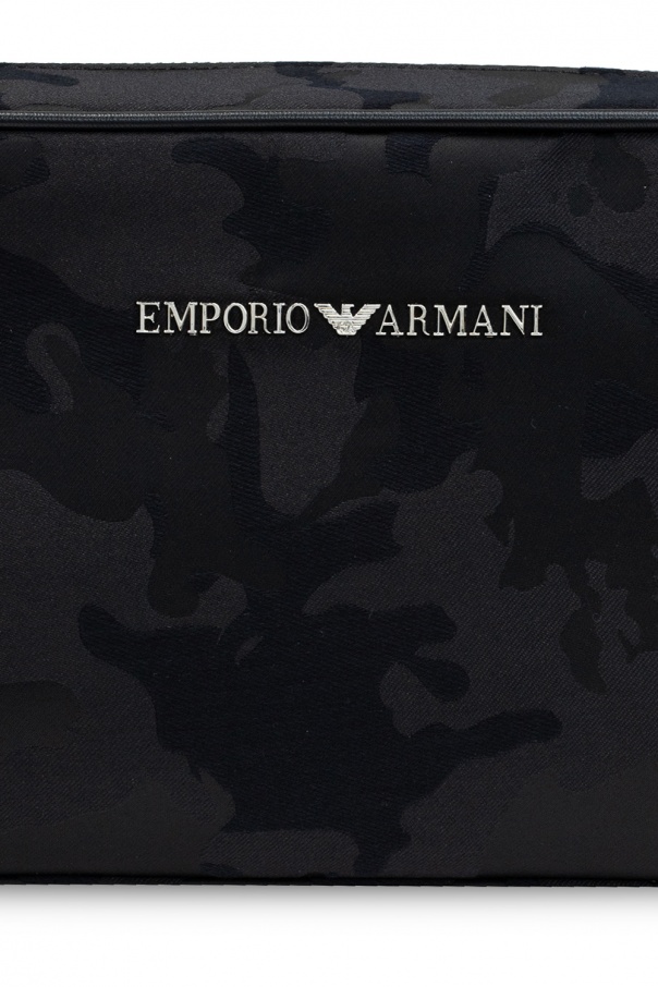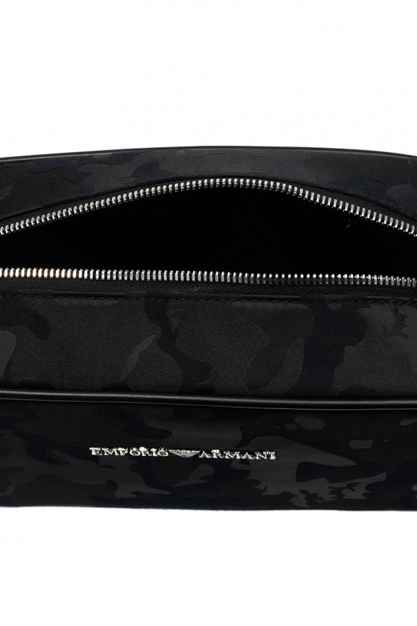 Black wash bag from Emporio Armani. Fastened with a zip, this design features a camo pattern, logo appliqué, adjustable shoulder strap, half-round handle, silver-tone metal hardware and one internal compartment with one slip pocket and one zip pocket.