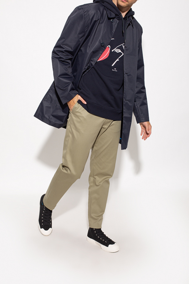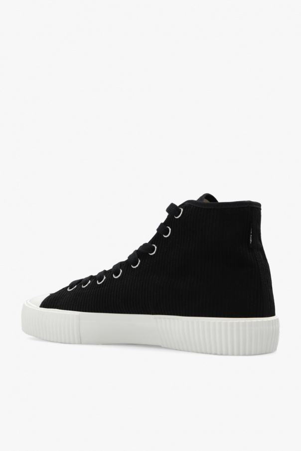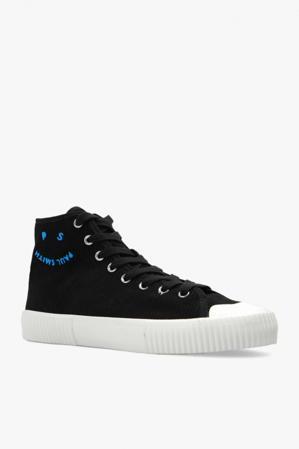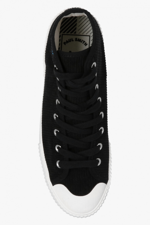 Black ‘Kibby’ high-top sneakers from PS Paul Smith. Rendered in corduroy, this lace-up model sits on a white rubber sole and features an embroidered blue logo.