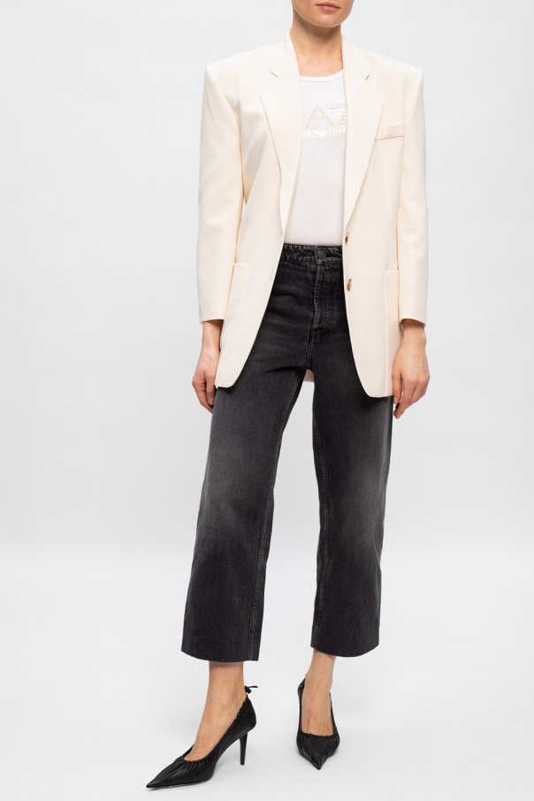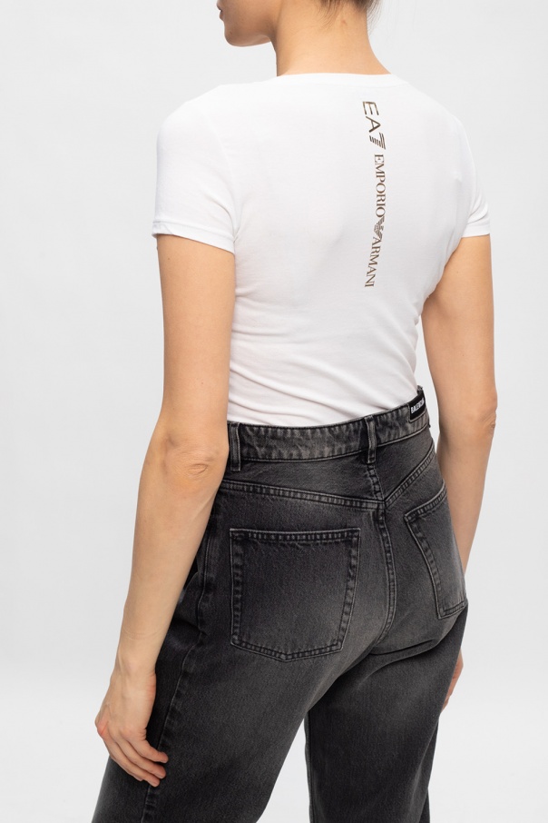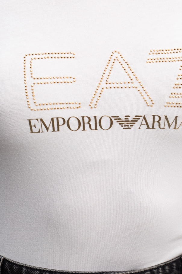 White crewneck T-shirt from EA7 Emporio Armani. Crafted from cotton, this style showcases the brand's logo which was rendered in print and sequins in gold-tone.