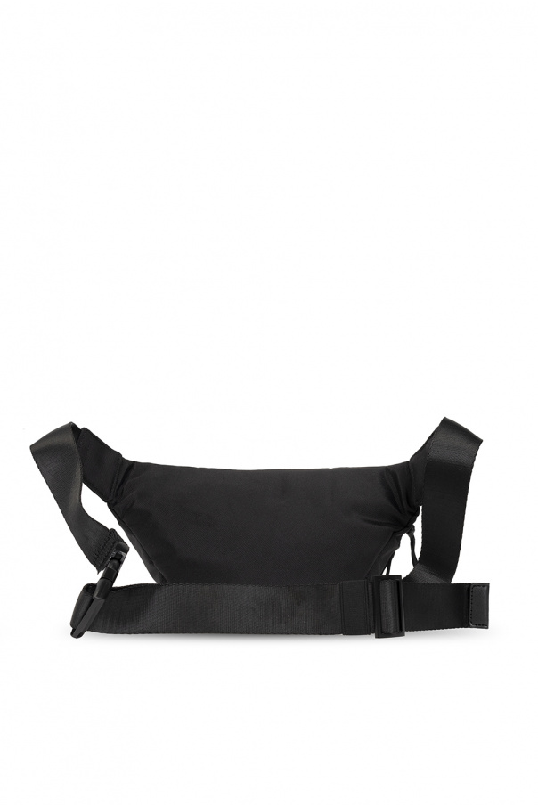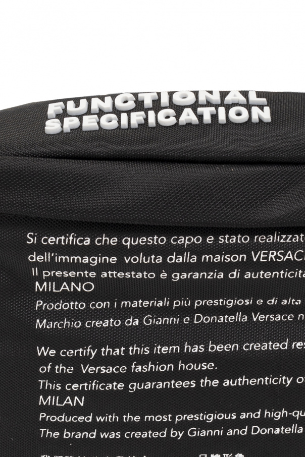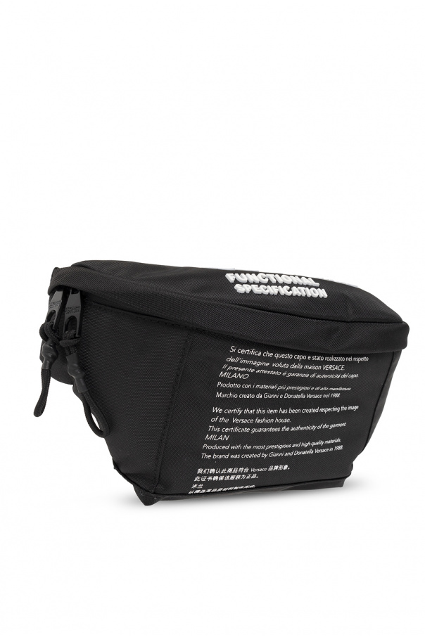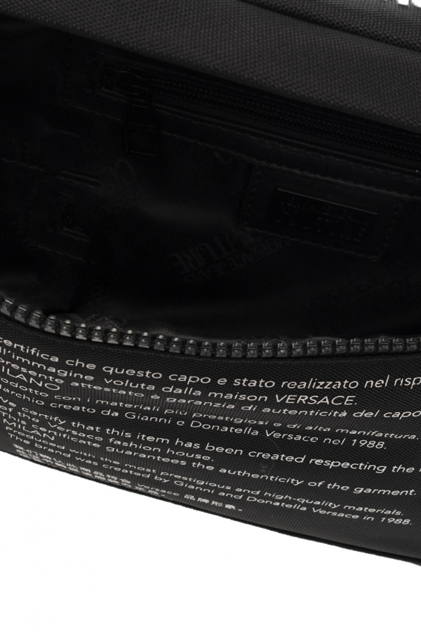 Black belt bag from Versace Jeans Couture. Crafted from canvas, this design secures with a two-way zip and showcases a white graphic print accompanied by a white tactile logo, an adjustable strap and one internal compartment with a zip pocket.