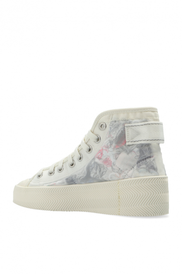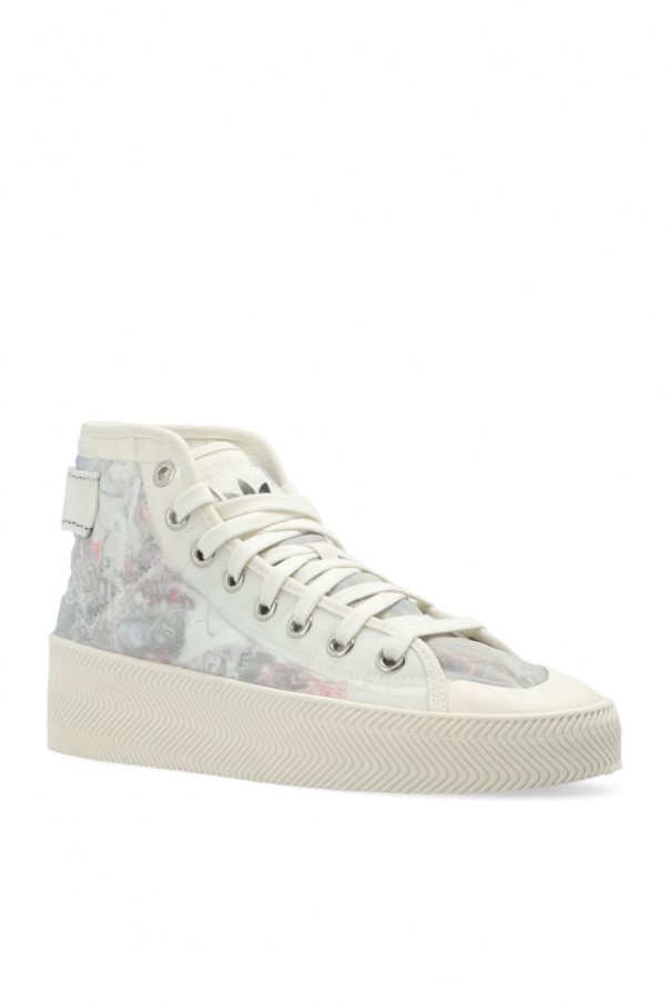White ‘Nizza Parley HI’ sneakers from ADIDAS Originals x Parley. Crafted with Primeblue – a high-performance recycled material made in part with Parley Ocean Plastic. 50% of the upper is textile, 75% of the textile is Primeblue yarn. This lace-up model has a high-top silhouette with transparent mesh trims, logo detailing and a white rubber sole. Swappable black shoelaces included.