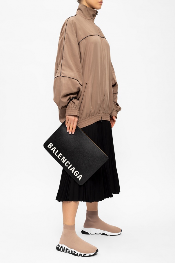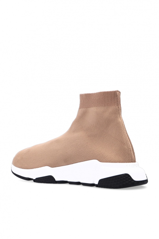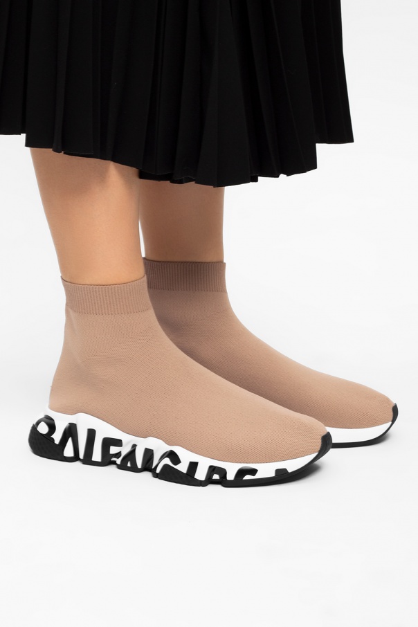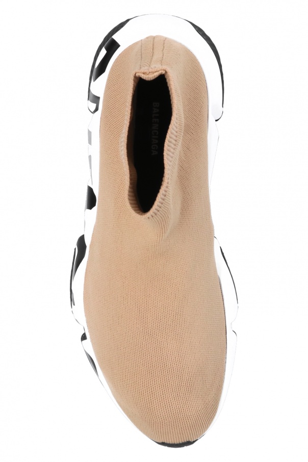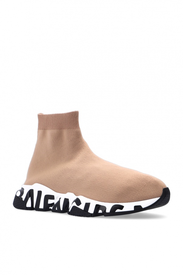 Beige ‘Speed’ sneakers from Balenciaga. Boasting a stretch knit upper with a sock-like cuff, this high-top silhouette sits on a white and black rubber sole and showcases a printed black logo.