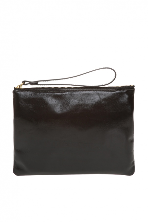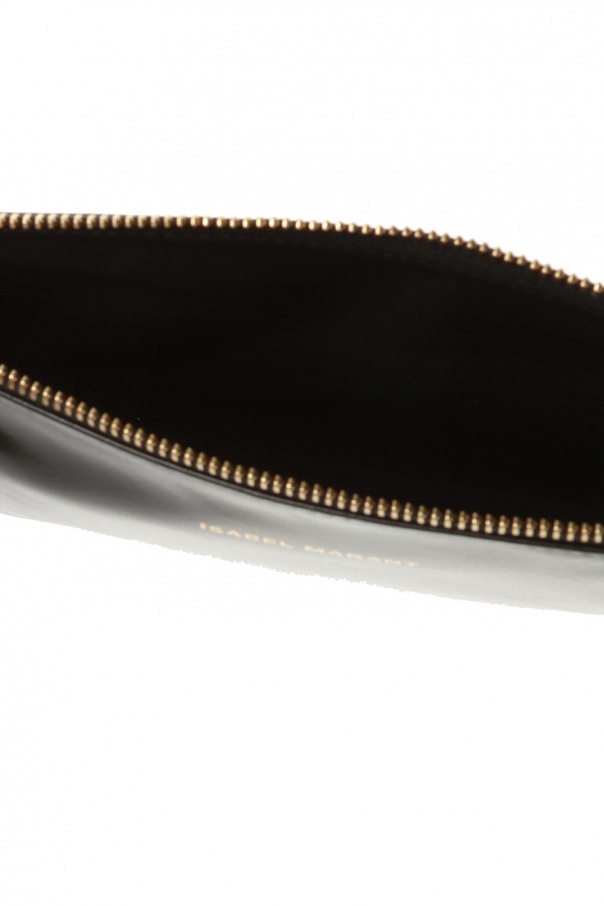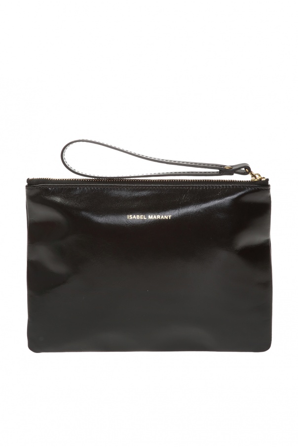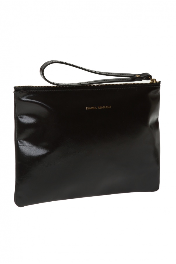 Black ‘Netah’ clutch with a wrist strap from Isabel Marant. Made of bovine leather. Zip fastening. Decorated with a gold-tone logo print. Black lining. One compartment inside.