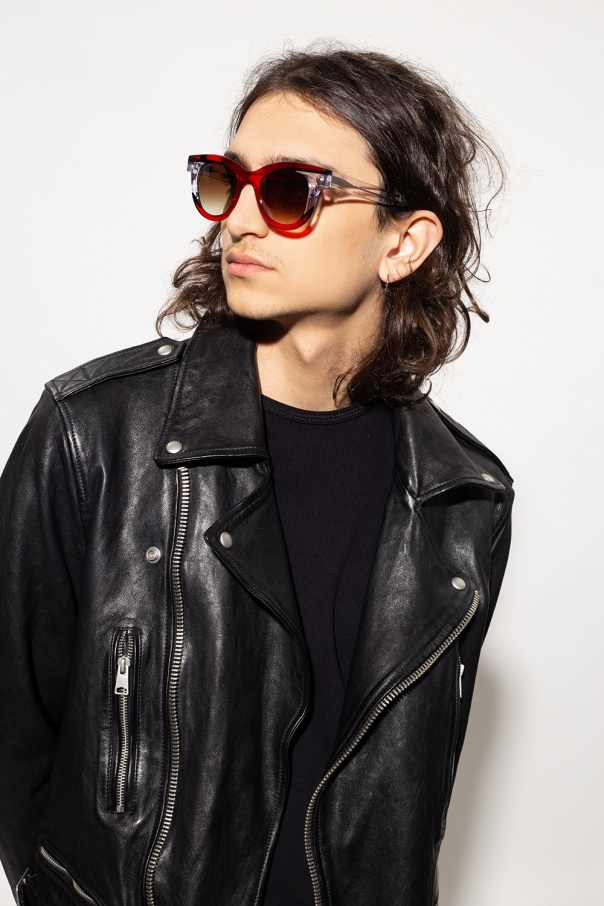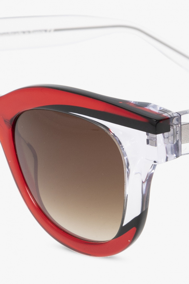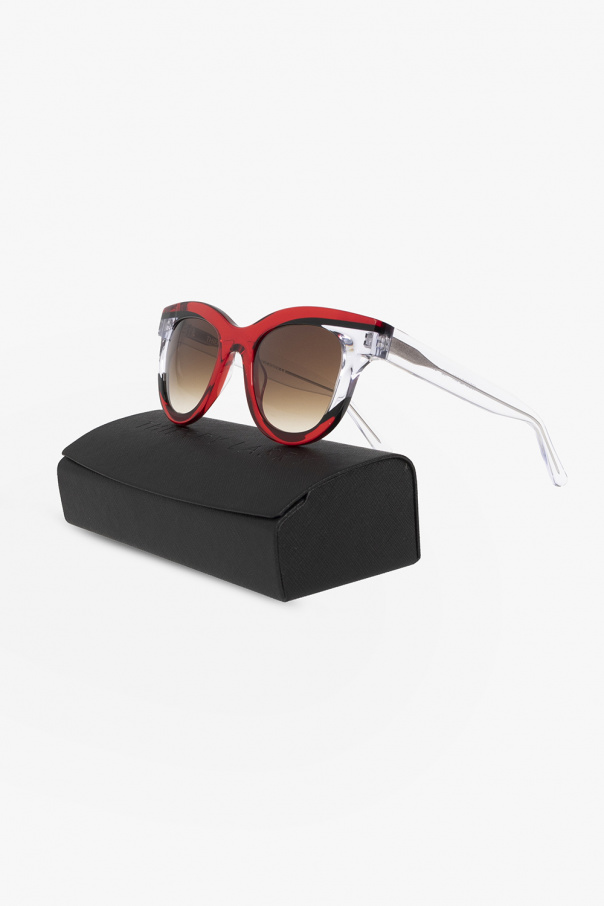Red, transparent ‘Icecreamy’ sunglasses from Thierry Lasry. Handcrafted in France from authentic Italian acetate, this pair has soft cat-eye frames with a sleek browline, narrow bridge, black stripes and grey, gradient lenses with 100% UV protection. Comes with a case.