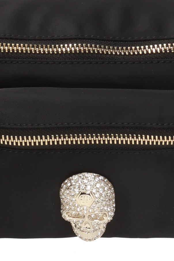 Black 'Skull' belt bag from Philipp Plein. Spruced up with a jeweled and glittered application with the designer's signature skull, this design fastens via zipper and employs gold-tone metal hardware, an external zip pocket on the front, an adjustable strap and one main internal compartment.