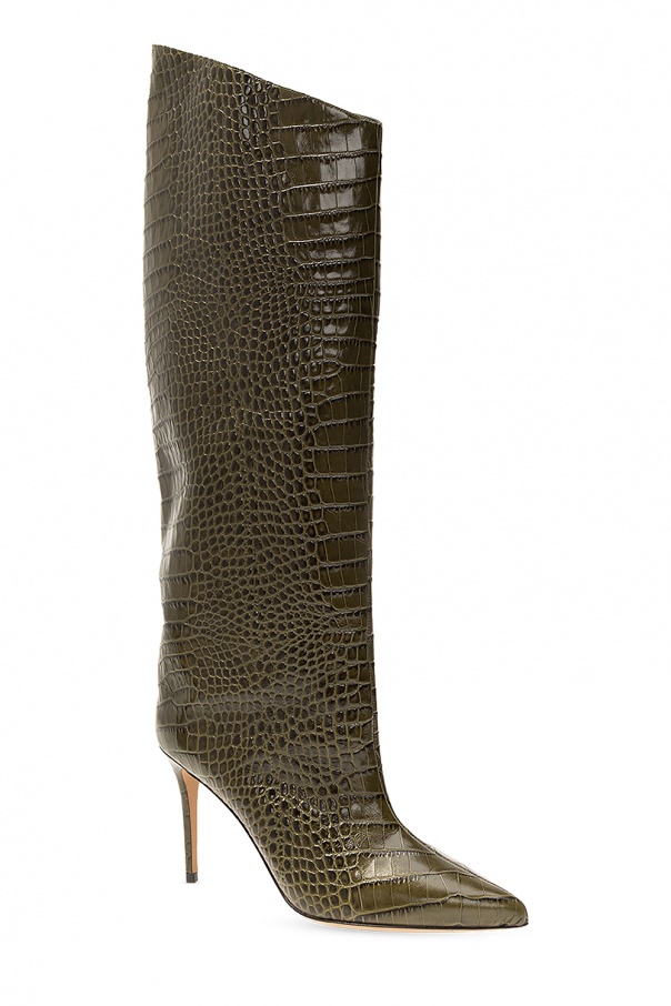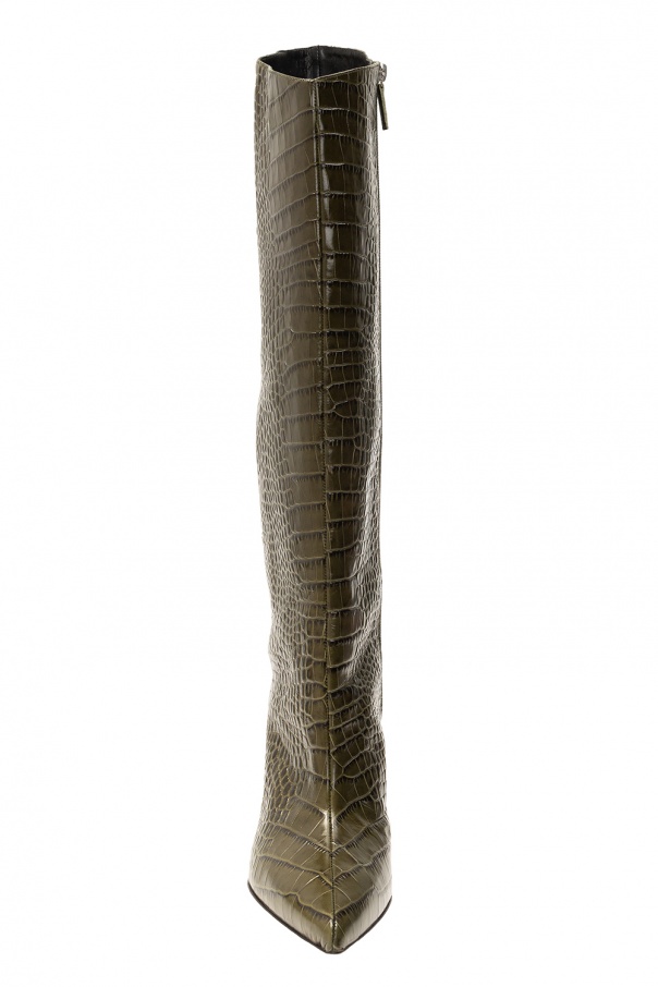 Dark green ‘Alex’ heeled knee-high boots from Alexandre Vauthier. Crafted from leather with a crocodile skin effect, this pair boasts a pointed toe silhouette with a side zip fastening and a brown leather sole.