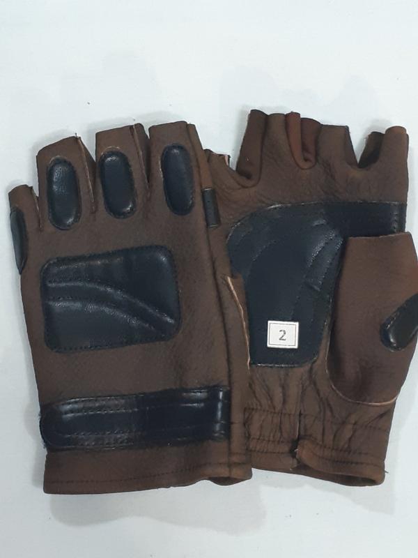 Митенки байкерские кожаные коричневые с застёжками на запястьях «липучка» шириной 25 мм; чёрными накладками с обеих сторон ладони и на внешней стороне фаланг пальцев. Кожа телячья, очень мягкая: толщина кожи 1,1 мм; толщина кожи накладок 0,7 мм. Длина от края перчаток до основания между средним и безымянным пальцами 16-17 см.; общая длина 19...19,5 см.