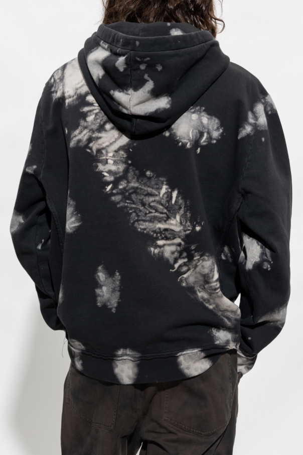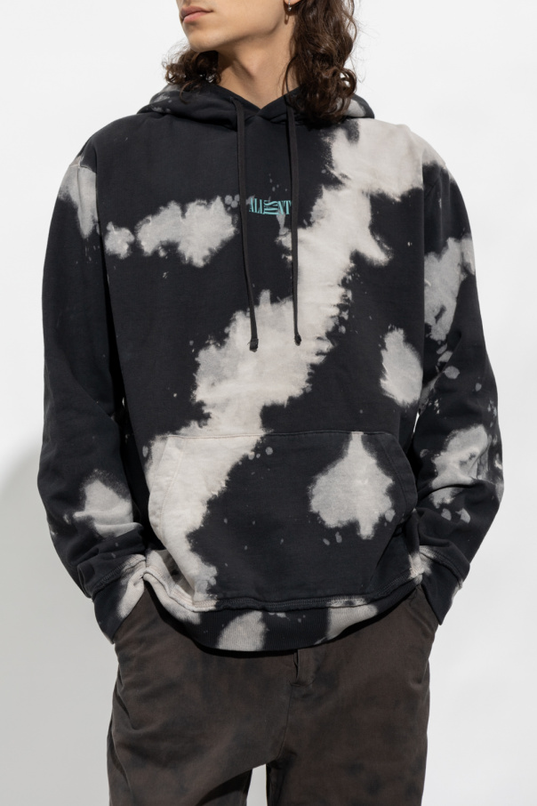 Grey ‘Santos’ hoodie from AllSaints. Crafted from organic cotton, this loose-fitting garment features a tie-dye motif, blue logo print, drawstring hood, front pocket and ribbed trims at the hem and cuffs.