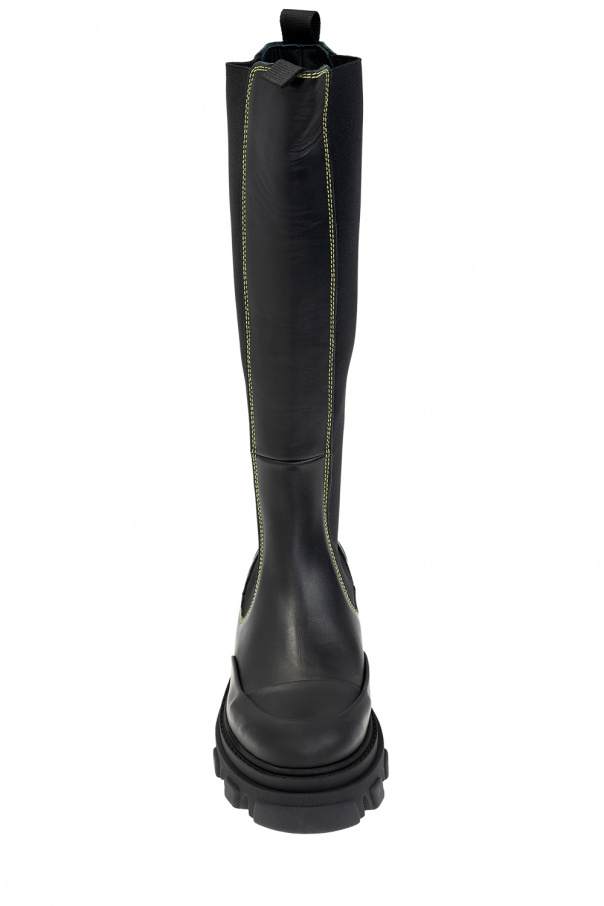 Black Chelsea boots from Ganni. Crafted from leather, this pair features elastic side panels, yellow stitching details, raised logo at the back and a black rubber sole.