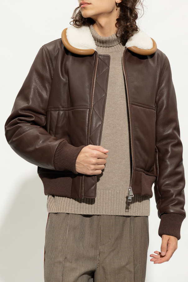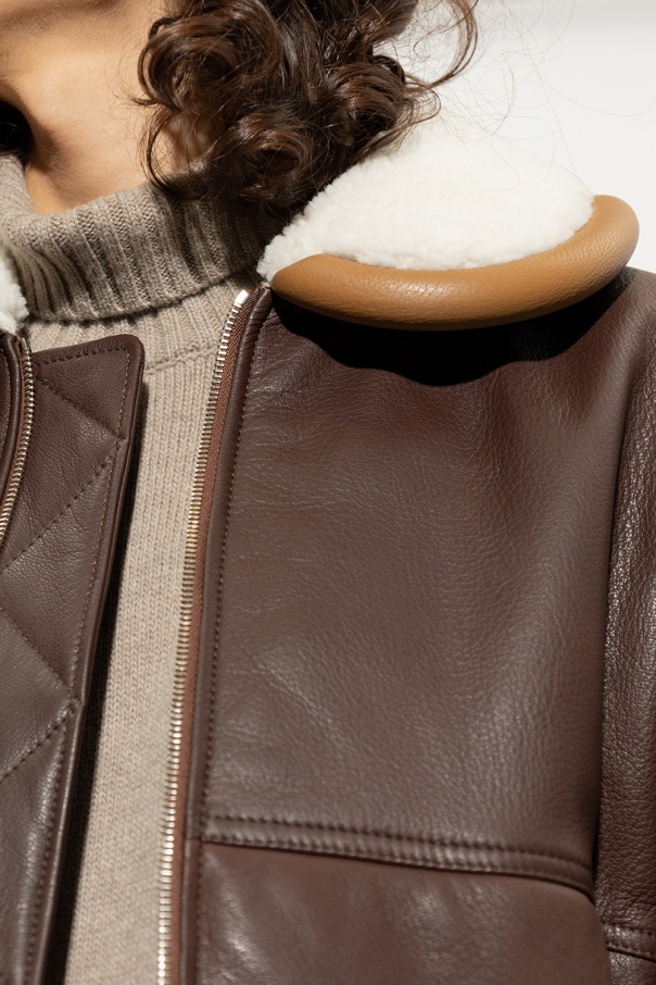 Brown shearling coat from JW Anderson. Crafted from goat leather, this style features a two-way zipper, two slip pockets, a fur collar and an elasticated bottom hem and cuffs.