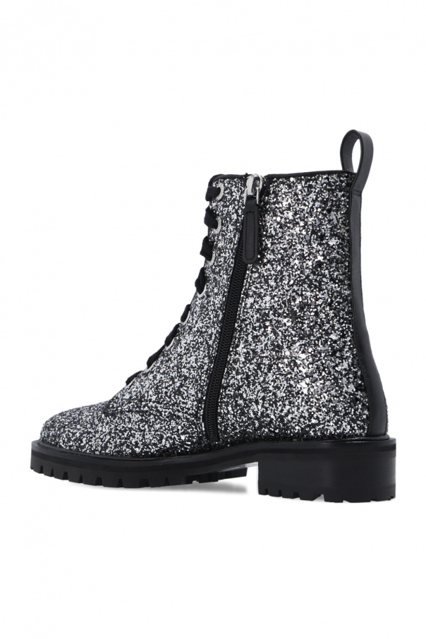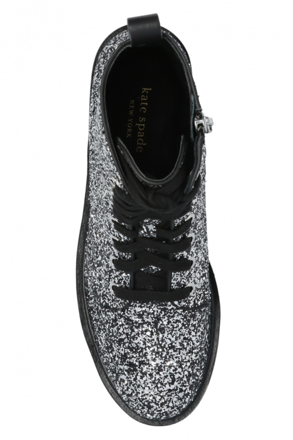 Silver-tone and black ‘Jemma’ lace-up ankle boots from Kate Spade. Made of leather and fabric, this almond toe pair is complete with a side zip and black rubber sole.