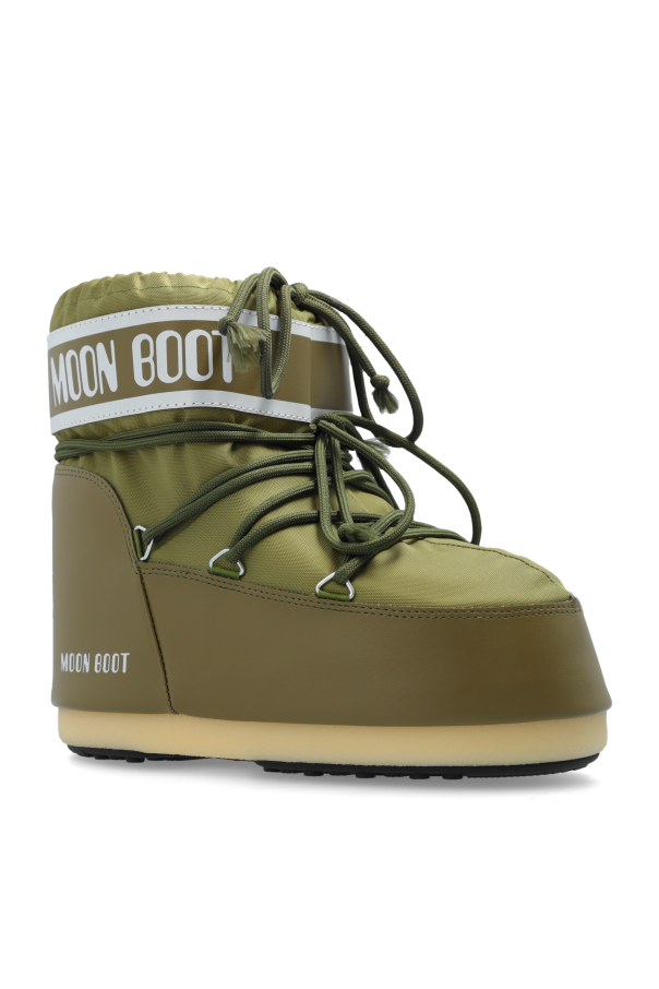 Introducing the Icon Low Nylon snow boots from the exclusive Moon Boot collection, designed specifically for women. These boots embody the perfect blend of style and functionality, making them a quintessential addition to any winter wardrobe. Crafted with a distinctive rounded silhouette, these snow boots feature a low-rise shaft that delicately sits below the ankle. The upper part is meticulously constructed from lightweight yet durable nylon, while the lower section boasts a synthetic material that ensures optimal water resistance. Comfort and warmth are paramount, and the interior is lined with a soft fabric that provides exceptional thermal insulation. The boots are adorned with a broad strap showcasing the iconic "MOON BOOT" branding, complemented by the logo's presence on the sides. The round laces, threaded through metal eyelets, offer an adjustable fit for enhanced support. The vibrant green hues of the boots are contrasted by a cream-colored outsole, adding a touch of elegance to their robust design. The thick sole not only insulates against the cold but also improves traction on snowy terrain. Why Choose This Product? Exclusive design from the renowned Moon Boot collection Lightweight and durable nylon upper Water-resistant synthetic lower section Soft, insulated interior for maximum comfort Striking green color with contrasting cream sole Enhanced traction and cold insulation with the thick outsole