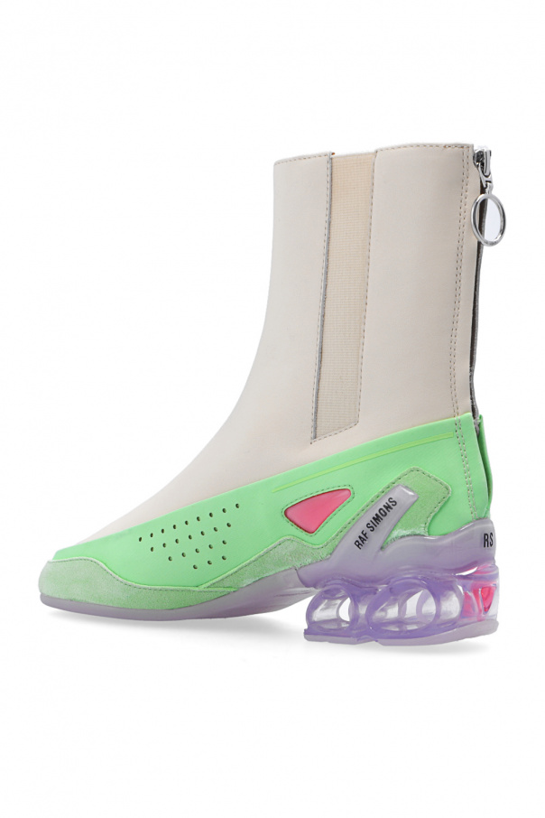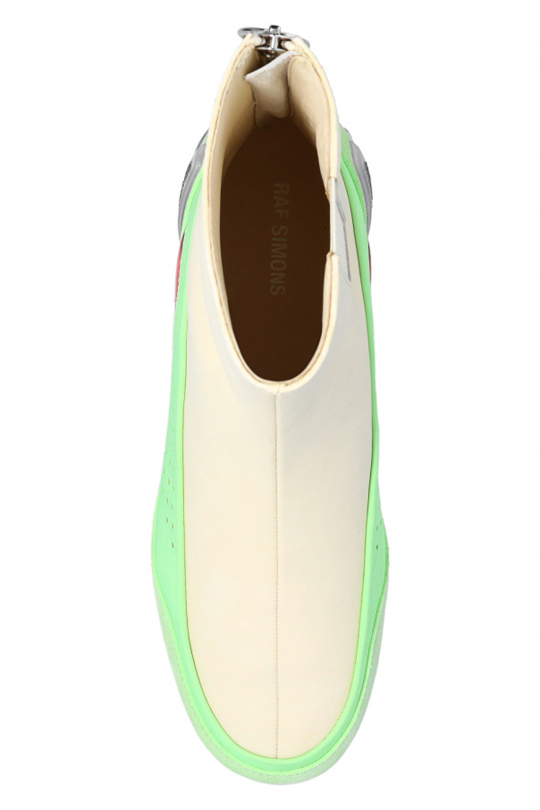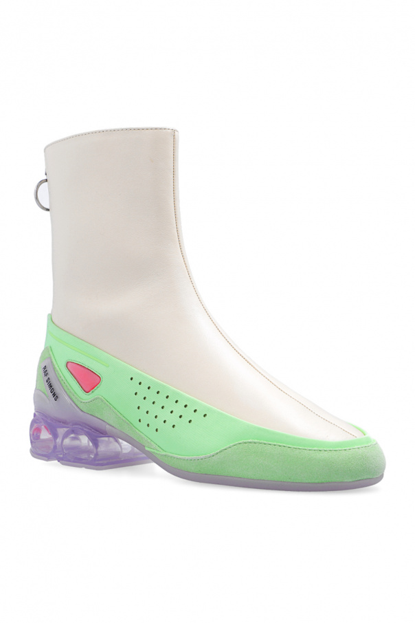 Beige, green and pink ‘Cycloid-4’ ankle boots from Raf Simons. Crafted from leather accentuated with side perforations and translucent rubber inserts, this lace-up model features suede details, a rubber heel ornament with contrasting logo prints and a cut-out heel counter in translucent rubber. It also has elastic panels, zip detailing, metal hardware, a leather lining and a purple rubber sole.