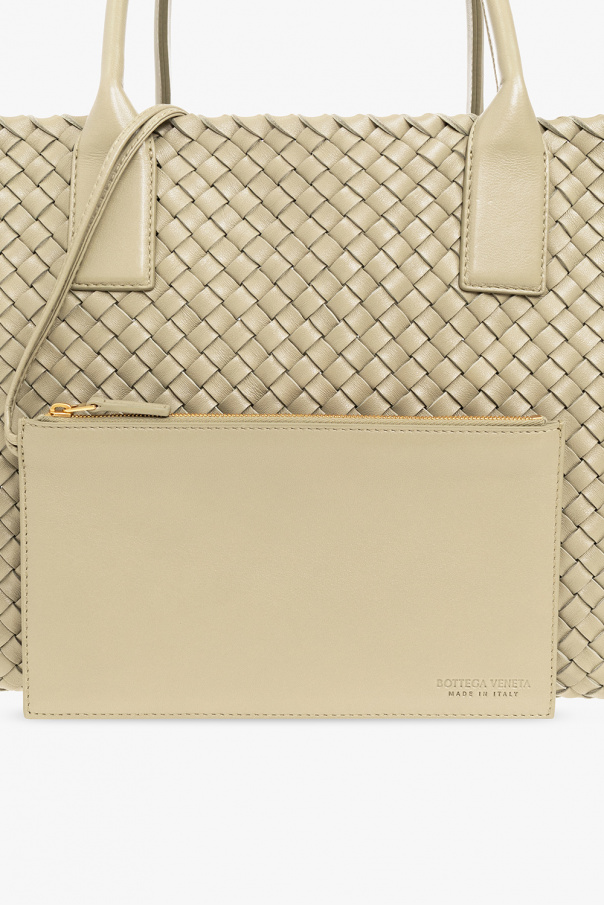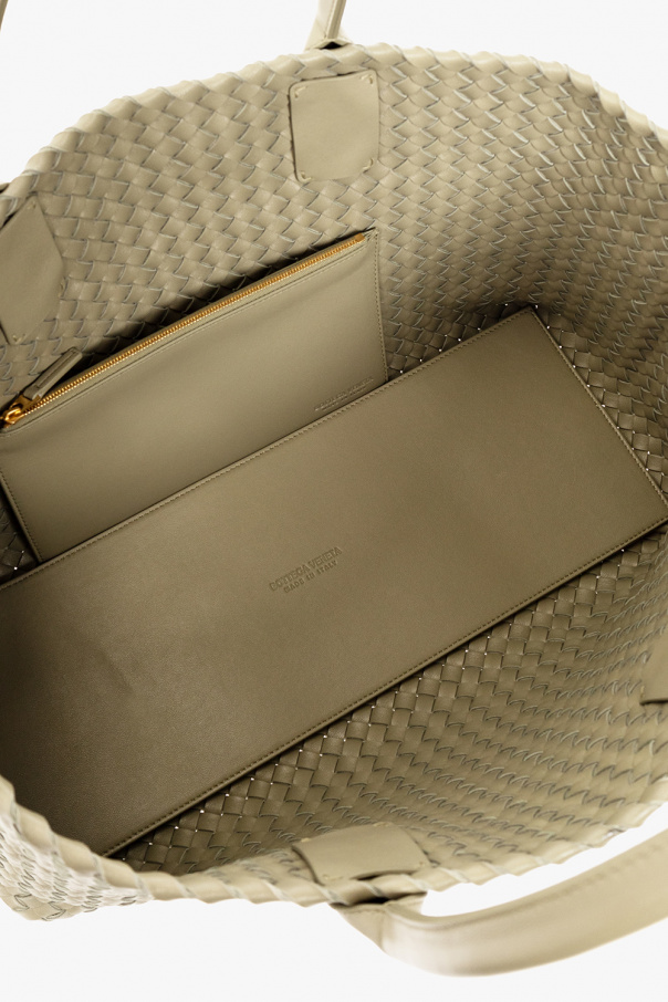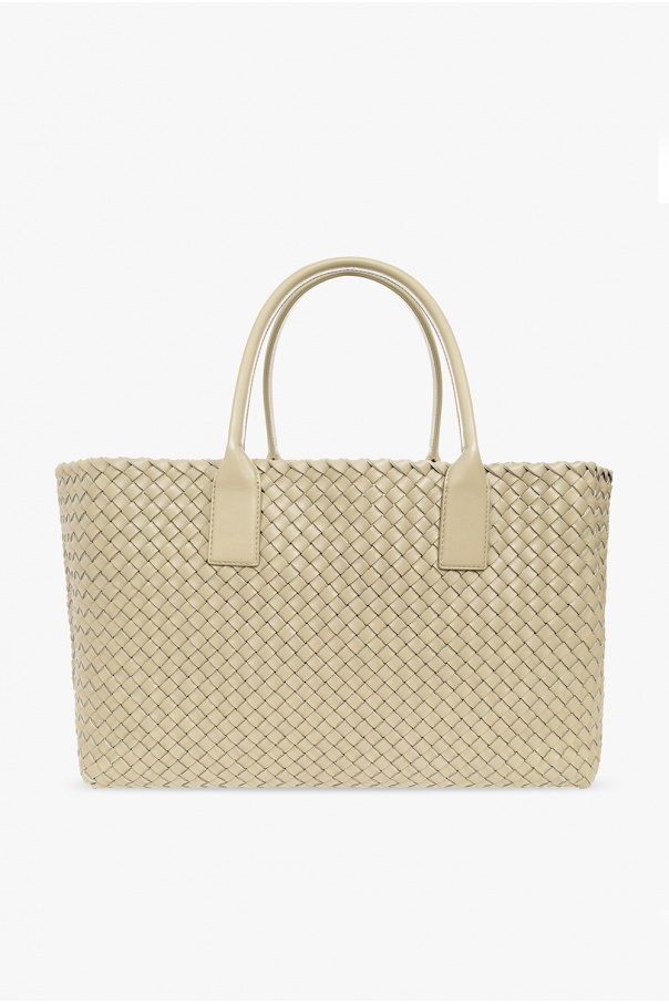 Greenish grey ‘Cabat Medium’ shopper bag from Bottega Veneta. Crafted from lamb leather, this model features the label’s signature Intreccio weave, two half-round handles, gold-tone metal hardware and one internal compartment with a detachable zipped pouch.