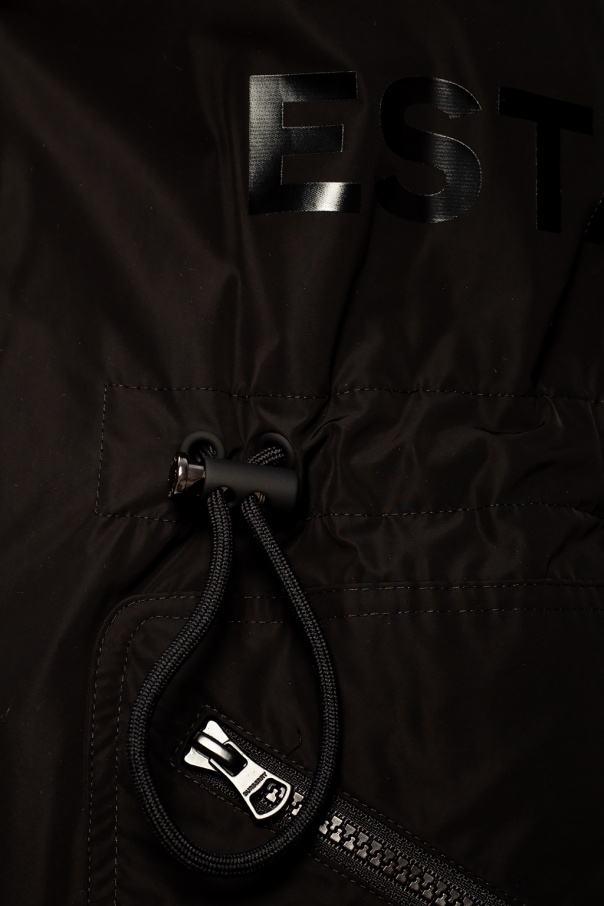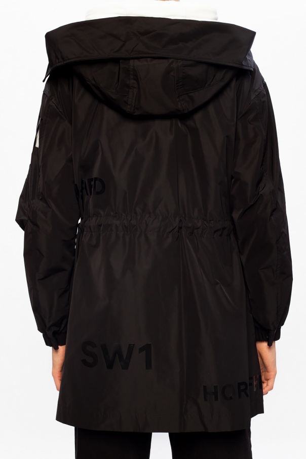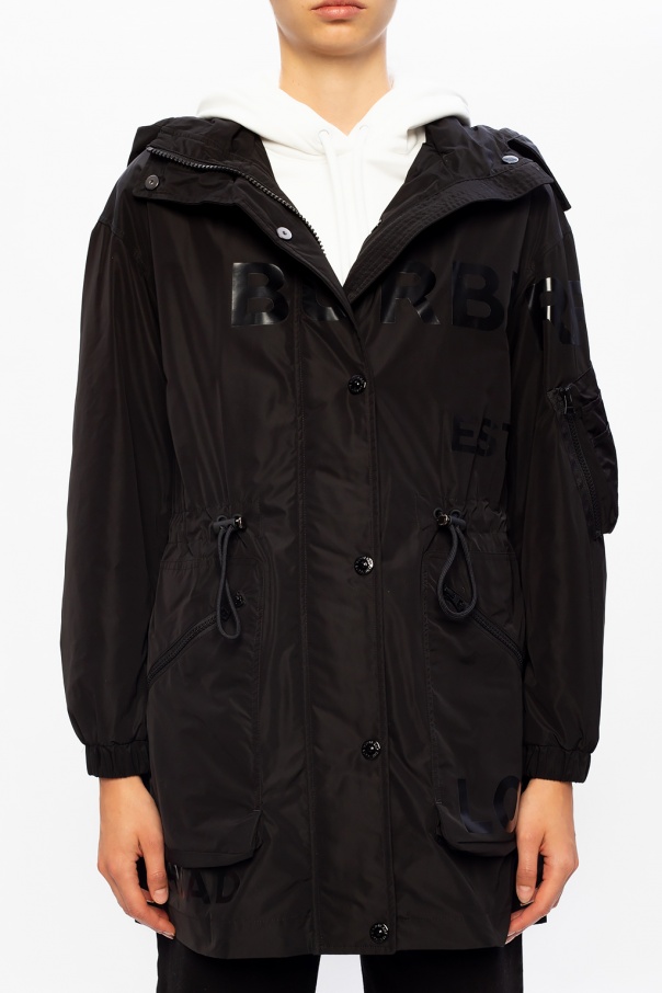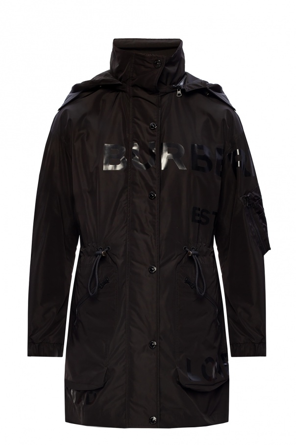 Black hooded coat from Burberry. Fastened with a zip and snaps, this garment features a drawstring waist, a logo print, two pockets on the front and one on the sleeve as well as a drawstring hood and ribbed cuffs.