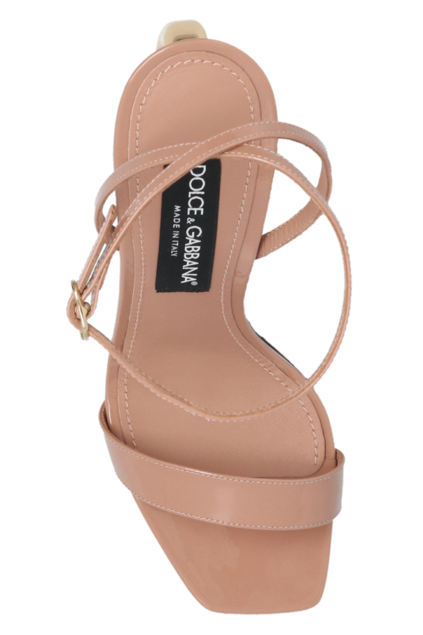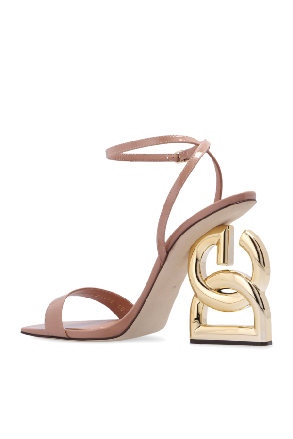 Beige ‘Kiera’ heeled sandals from Dolce & Gabbana. Made of patent calf leather, this model features buckled ankle straps, decorative DG logo heel made of gold-plated carbon fiber and a beige leather sole.