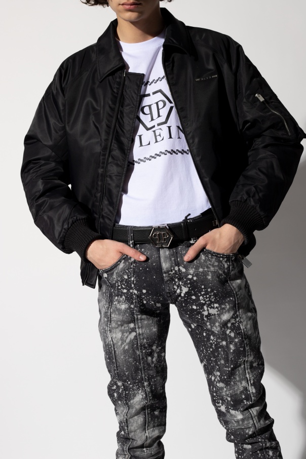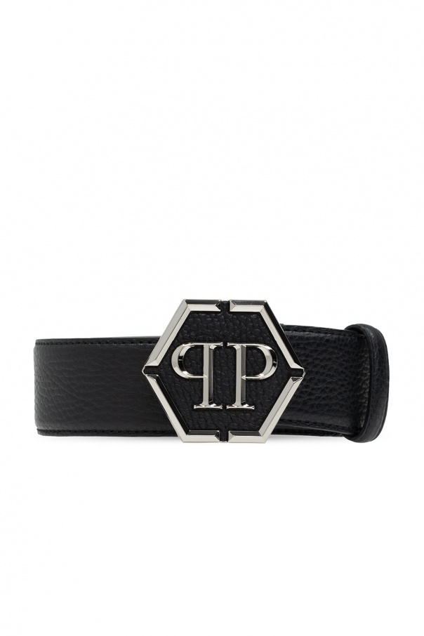 Black belt from Philipp Plein. Crafted from leather, this item fastens with a logo buckle in silver-tone and black.