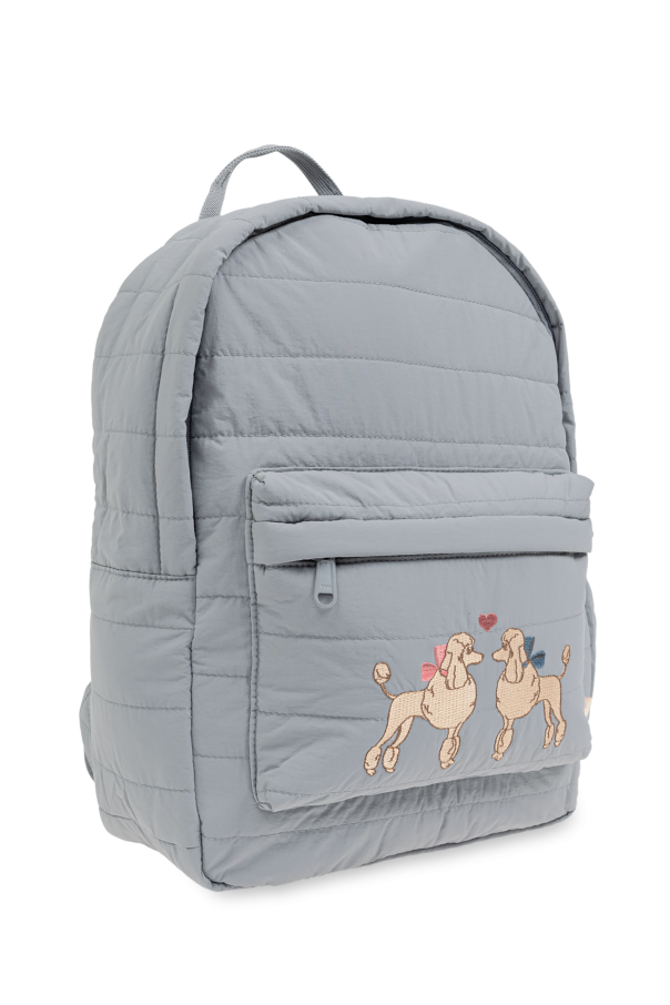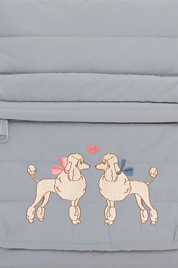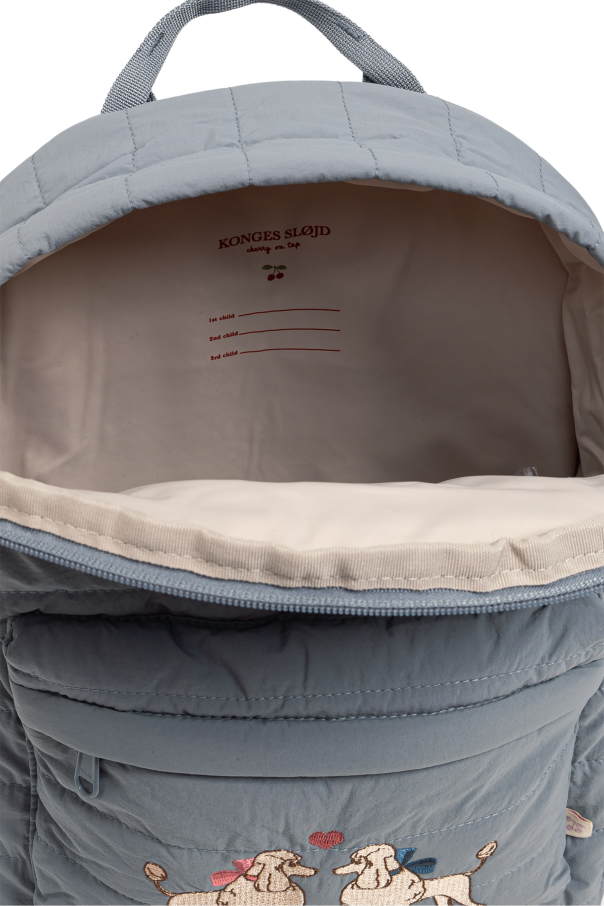 Introducing the Quilted Kids Backpack by Konges Sløjd, a paragon of sophistication and functionality designed exclusively for young adventurers. This meticulously crafted piece, with its classic rectangular silhouette and rounded edges, exudes an elegant yet playful charm. Enveloped in a rich blue hue, the backpack's quilted exterior not only enhances its aesthetic appeal but also augments its durability and comfort. Made from resilient, easy-to-clean materials, the exterior is composed of 100% Nylon, while the interior and filling are crafted from 100% Polyester, ensuring a robust and lasting construction. A standout feature of this backpack is its enchanting embroidered design on the front pocket, depicting two poodles adorned with bows and a heart nestled between them, adding a touch of whimsical allure. The backpack is equipped with a dual-zippered main compartment and a front zipper pocket, providing ample storage for essentials. Additionally, a side pocket is perfect for carrying a water bottle. The adjustable shoulder straps and an additional chest strap ensure a comfortable and secure fit, making it ideal for everyday use. The interior, featuring the distinguished Konges Sløjd logo, reaffirms its exclusive and premium quality. A top handle adds versatility, allowing it to be carried by hand effortlessly. Why Choose This Product? Exquisite Design: Classic shape with a charming embroidered motif. Durable Materials: Easy-to-clean, water, and wind-resistant fabric. Ample Storage: Spacious compartments, including a water bottle pocket. Comfortable Fit: Adjustable straps with an additional chest strap. Exclusive Brand: Features the prestigious Konges Sløjd logo.