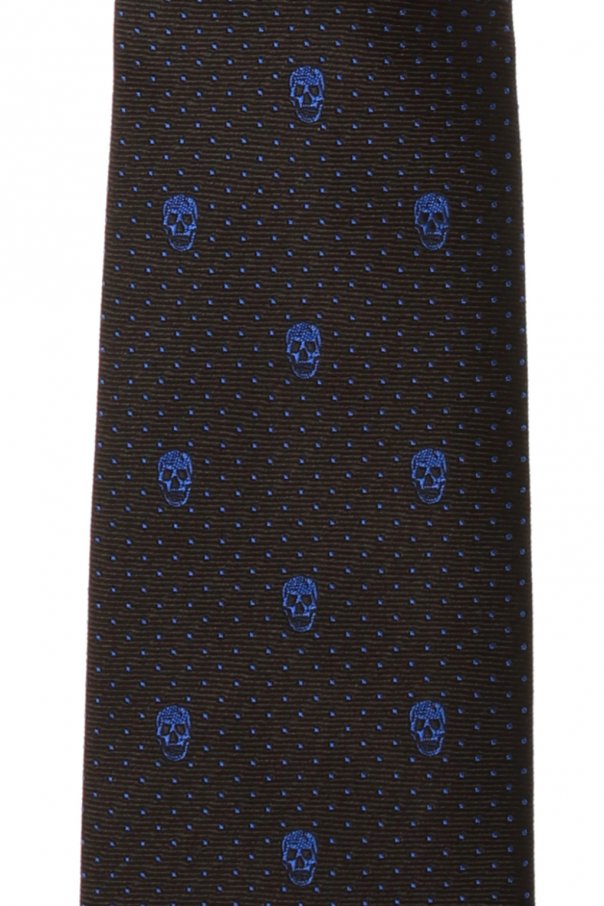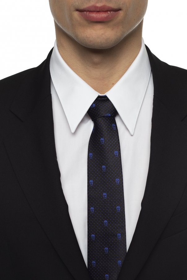 Navy tie from Alexander McQueen. Made of silk. Decorated with a polka dot pattern and the brand’s signature skull motif in blue.