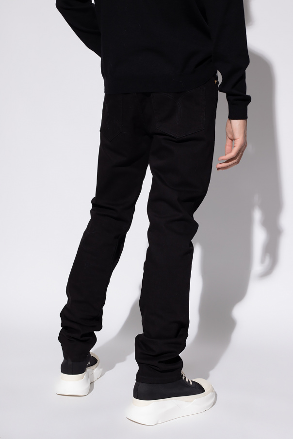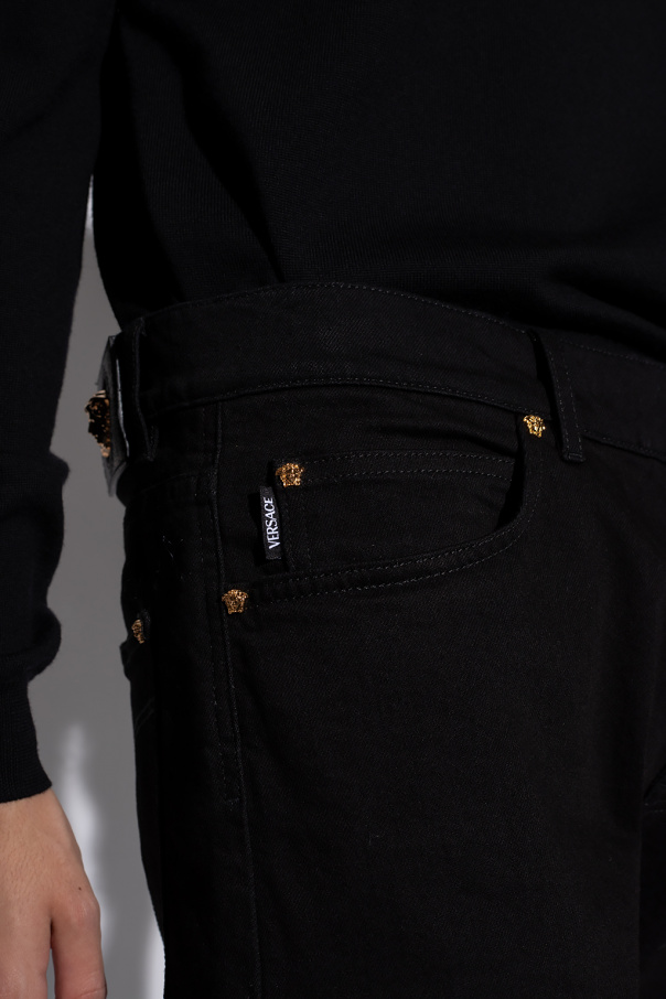 Black jeans from Versace. Falling down with tapered legs, this pair features a zip fly with a button, classic five pockets, gold-tone metal hardware and a patch with a tactile Medusa head plaque at the back.