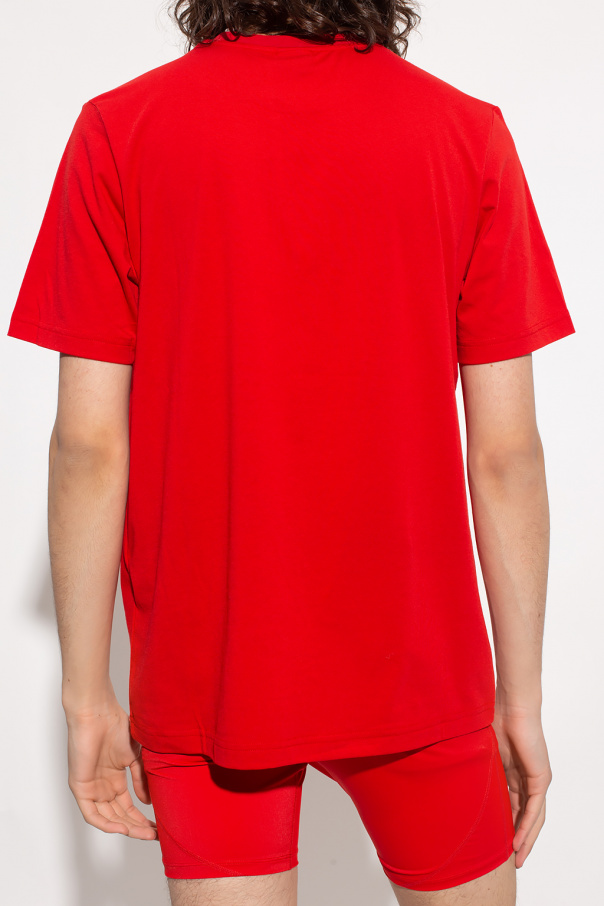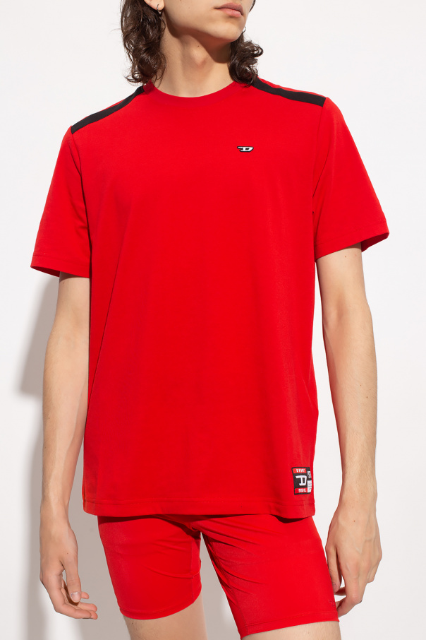 Red 'AMTEE-FREASTY-HT04' crewneck T-shirt from Diesel, the ‘Sport 55DSL’ collection. Made of cotton, this style features an elasticated collar, short sleeves decorated with black inserts, a logo patch on the front and a white, red and black tag at the hem.