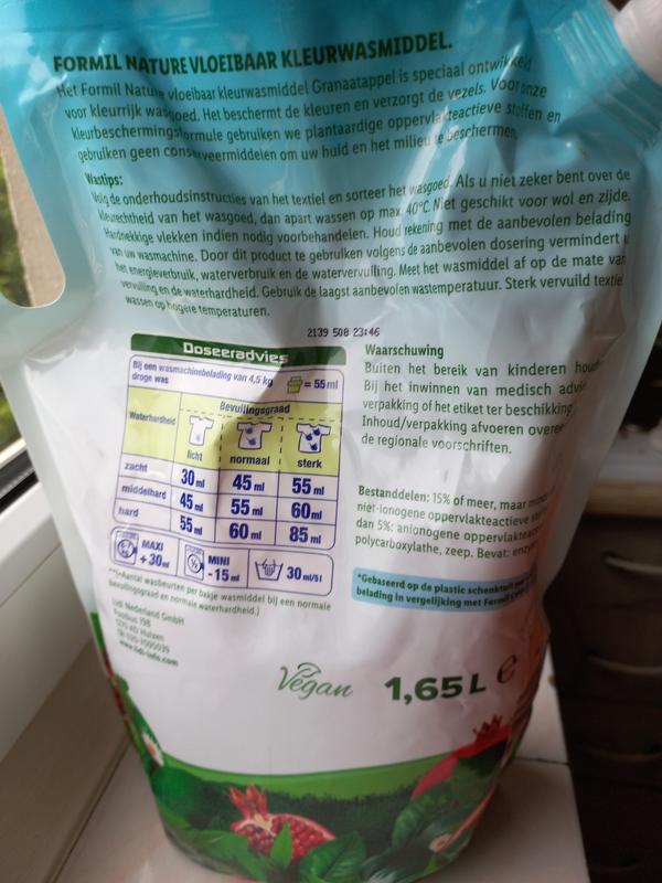 Засіб для прання Formil nature має концентрований склад та розрахований на 30 прань ємністю 1,65 л. Діє за температури від 20 до 60 градусів прання за Цельсієм. Має легкий та приємний гранатовий аромат.Дозування: використовуйте від 30 до 55 ml гелю для прання Formil nature при 4-5 кг завантаження пральної машинки одягом. За середнього ступеня забруднень. НЕ ПІДХОДИТЬ для прання вовни та шовку.