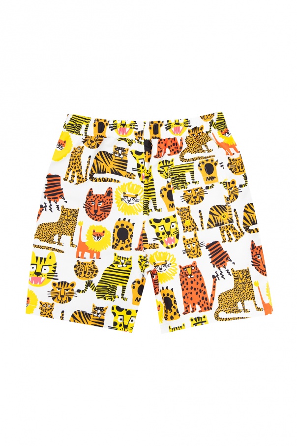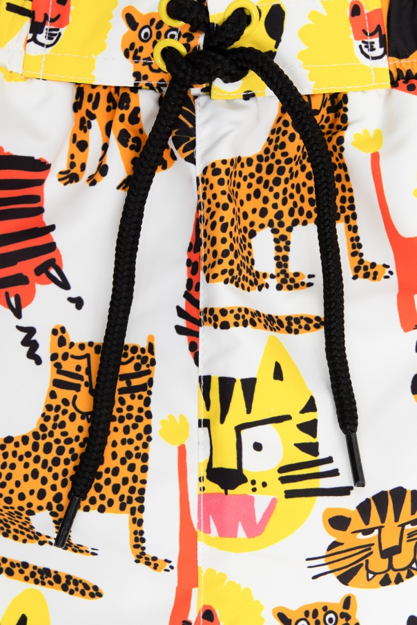 White swim shorts from Stella McCartney Kids. Illustrated with a colourful animal print, this pair features an elasticated waistband with a drawstring fastening, two side seam pockets and a back flapped pocket with a velcro closure.