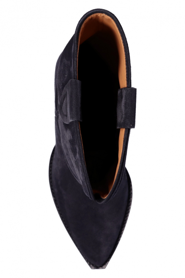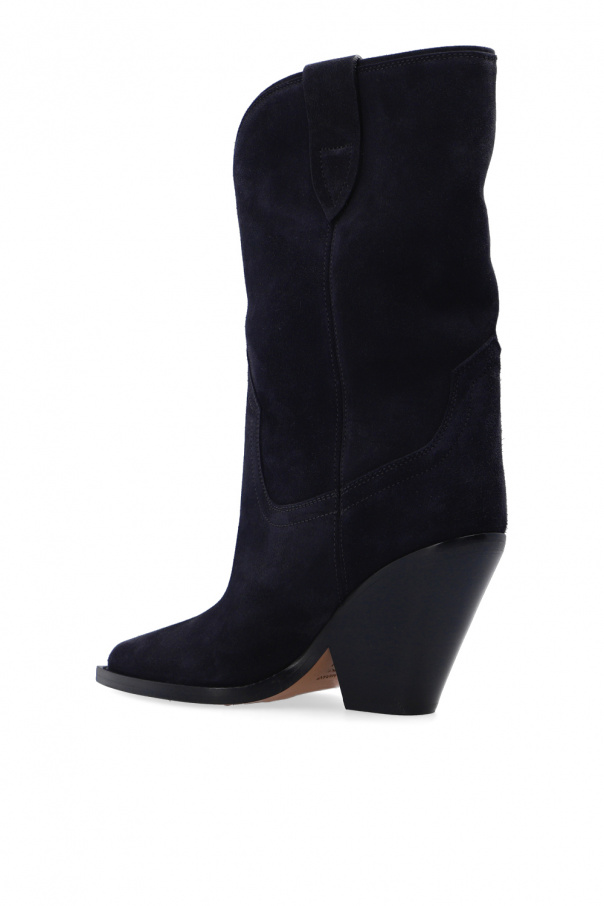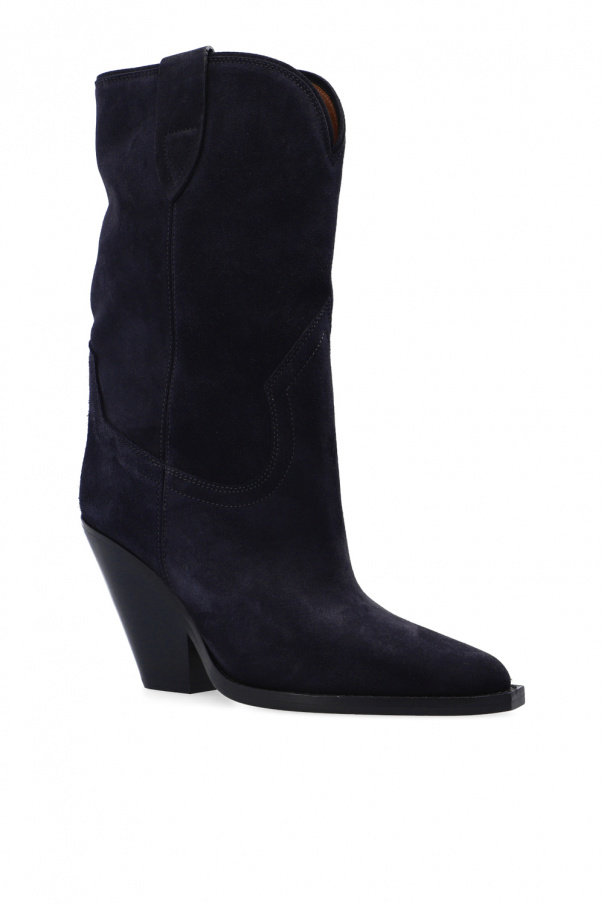 Navy blue ‘Laxime’ heeled ankle boots from Isabel Marant. Made of calf suede, this model features a slip-on silhouette, a pointed toe, distinctive stitching details and a beige leather sole.