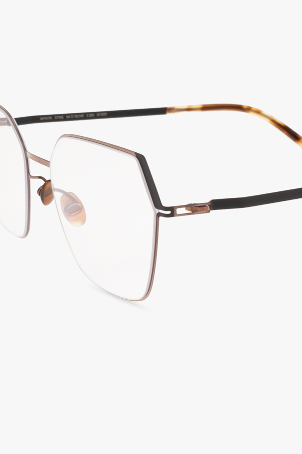 Black and copper-coloured ‘Stine Shiny’ optical glasses from Mykita. Handcrafted in Berlin from lightweight stainless steel, this model features temples with patented spiral hinges and tortoiseshell tips. Case included.