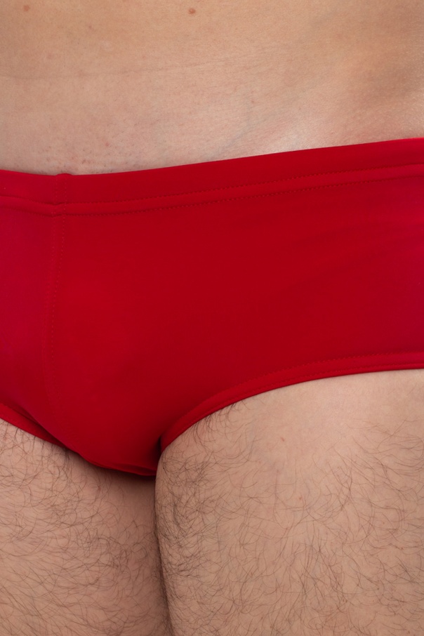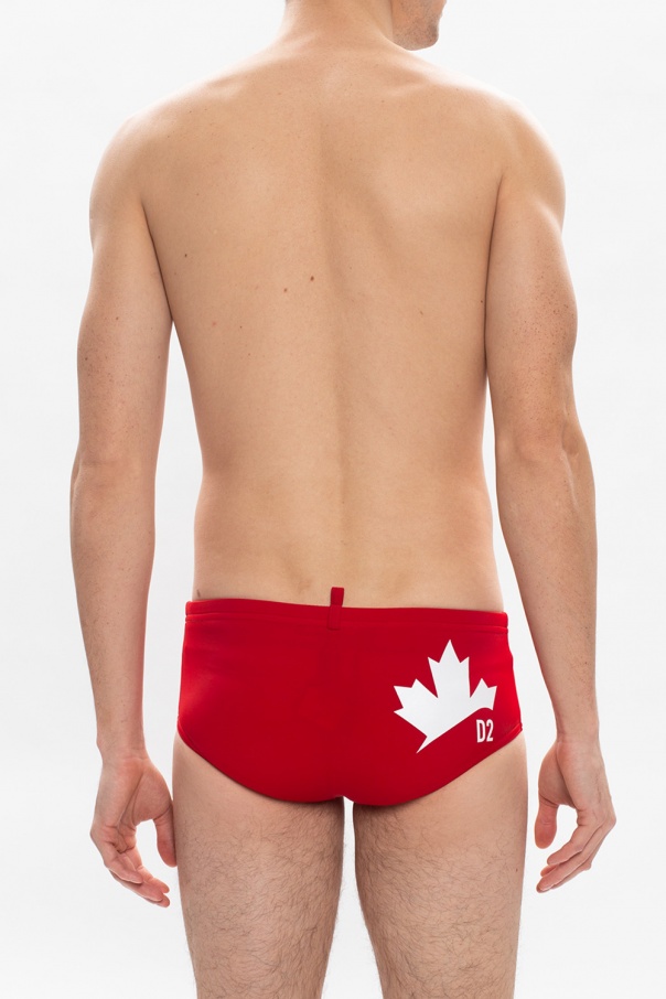 Red swim briefs from Dsquared2. Fastened with drawstrings, this design is decorated with a white logo print.