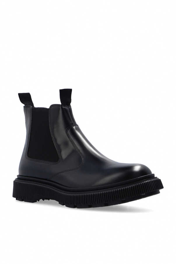Black ‘Type 156’ Chelsea boots from Adieu Paris. Made of leather, this slip-on pair features elastic panels, almond toe and black rubber sole.