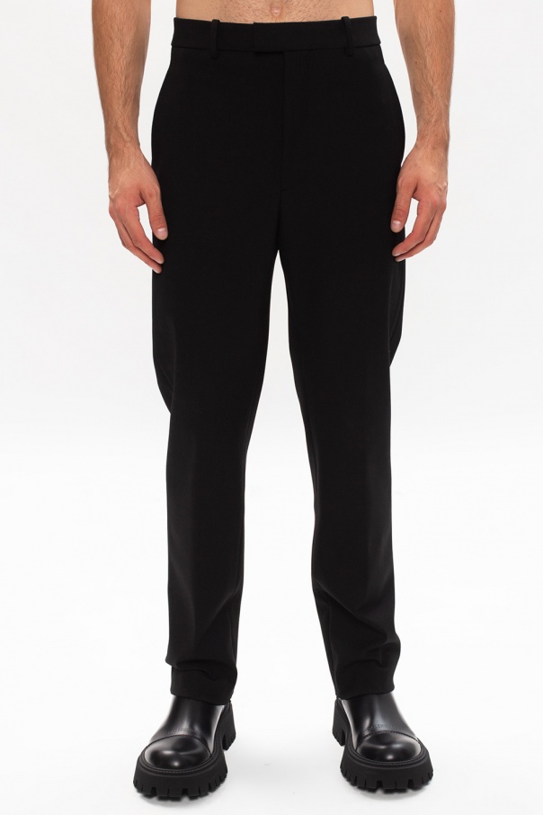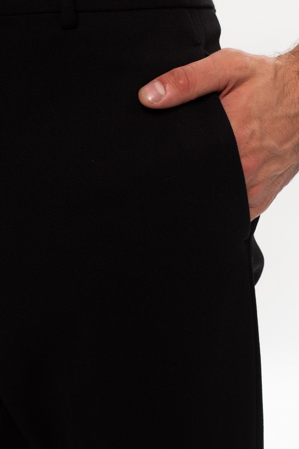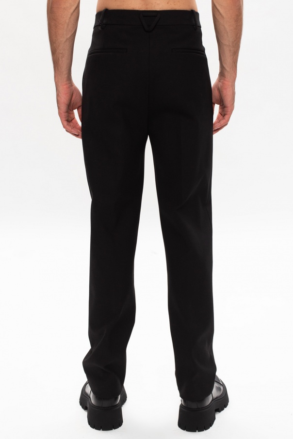 Black pleat-front trousers from Bottega Veneta. Crafted from fabric blend including virgin wool, this pair employs zip fly with hook & eye closure, four pockets and zipped leg openings.