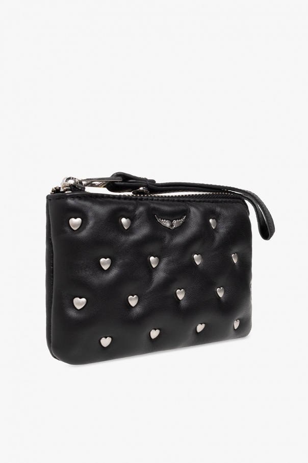 Black ‘Uma Mini’ clutch from Zadig & Voltaire. Crafted from leather and punctuated with heart-shaped studs, this design features a zip fastening, the brand's signature wings application, silver-tone metal hardware and one internal compartment.