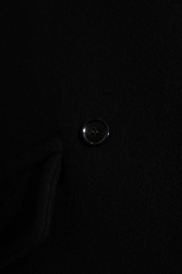 Black double-breasted coat from Alaia. Crafted from virgin wool, this oversize design features buttons, a collar, two flap pockets, long sleeves with low shoulders and a pleat at the back.