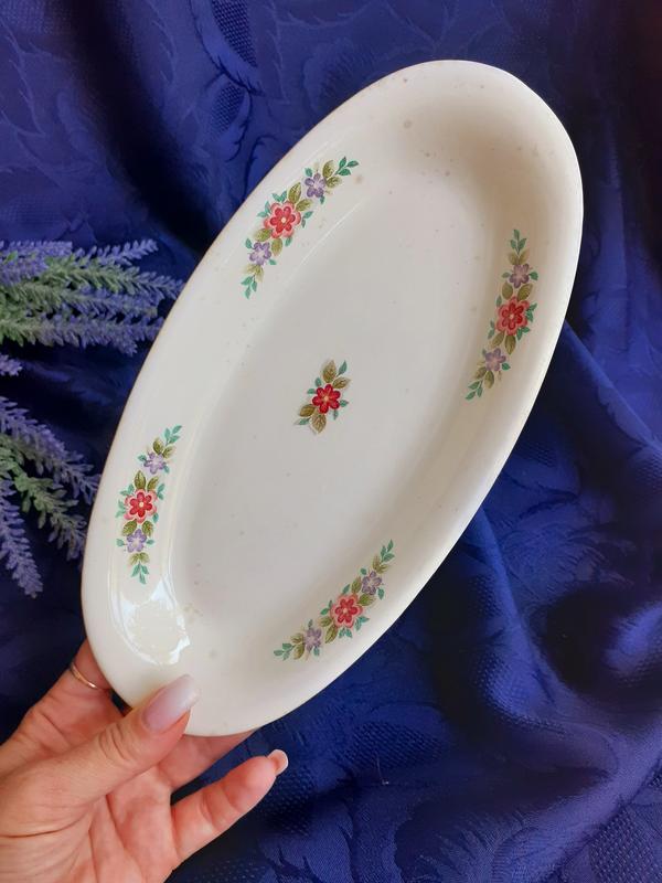 Блюдо средних размеров, продолговатой формы. Длина изделия - 24 см, ширина - 14 см.