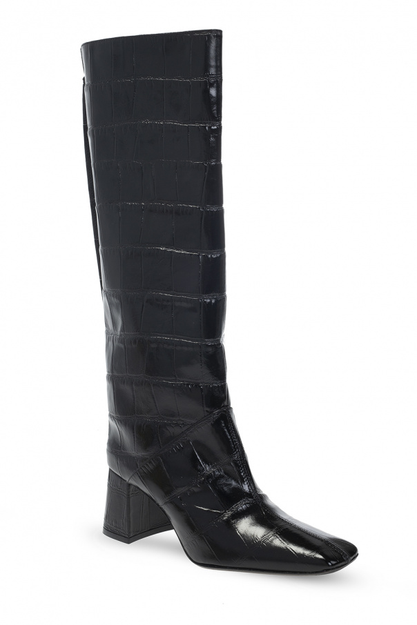 Black ‘Finola’ heeled boots from Red Valentino. Crafted from leather with a crocodile skin effect, this square toe design rests on a beige leather sole.