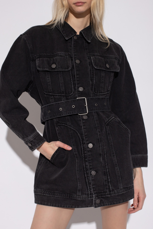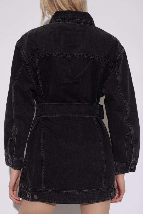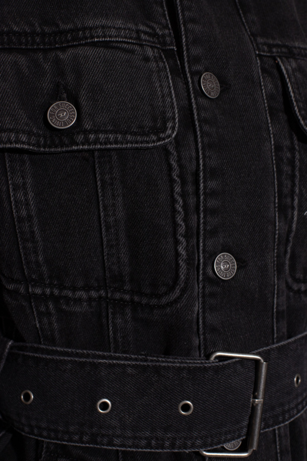 Black ‘De-Flamina’ denim jacket from Diesel. Made of cotton, this style features button fastenings, a waist-cinching belt with a silver-tone buckle, two slip pockets, long sleeves and red logo embroidery for brand recognition.