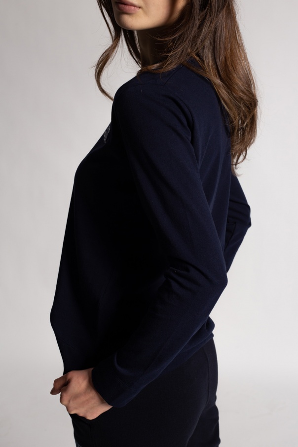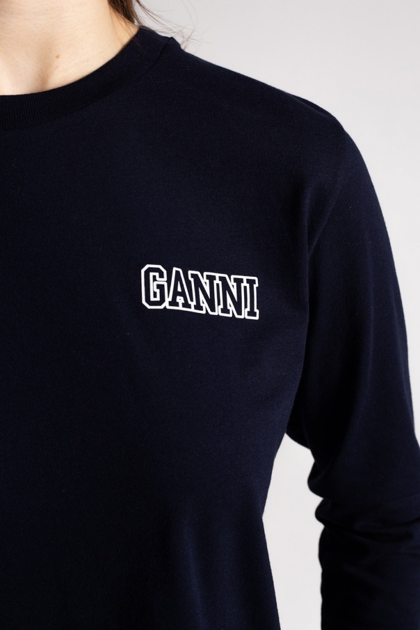 Navy T-shirt from Ganni. Crafted from certified recycled EcoLife® yarn, this long-sleeved design features a printed logo pattern in white, ribbed round neck and slits at the hem. EcoLife® is made from 50% post-consumer recycled polyester, such as PET plastic bottles, and 50% pre-consumer recycled cotton from end-of-line manufacturing scraps that would otherwise go to waste.