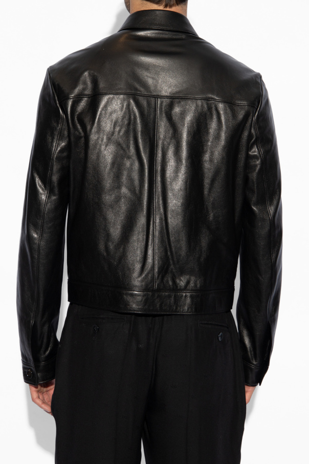 Black jacket from Dolce & Gabbana. Made from lamb leather, this style fastens via a zip and features a collared neckline, three frontal pockets (one is zipped) and long sleeves with button cuffs.