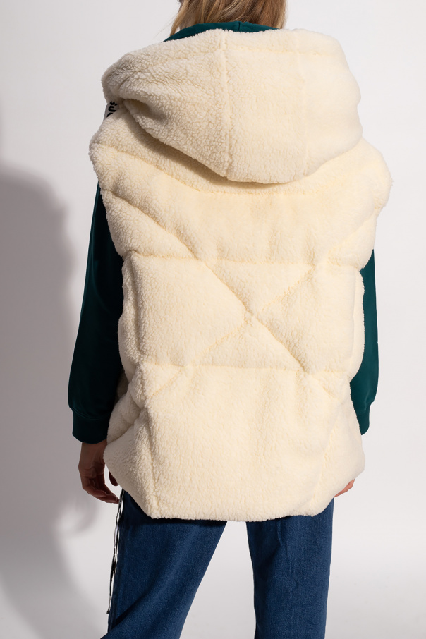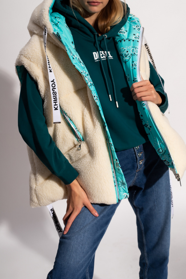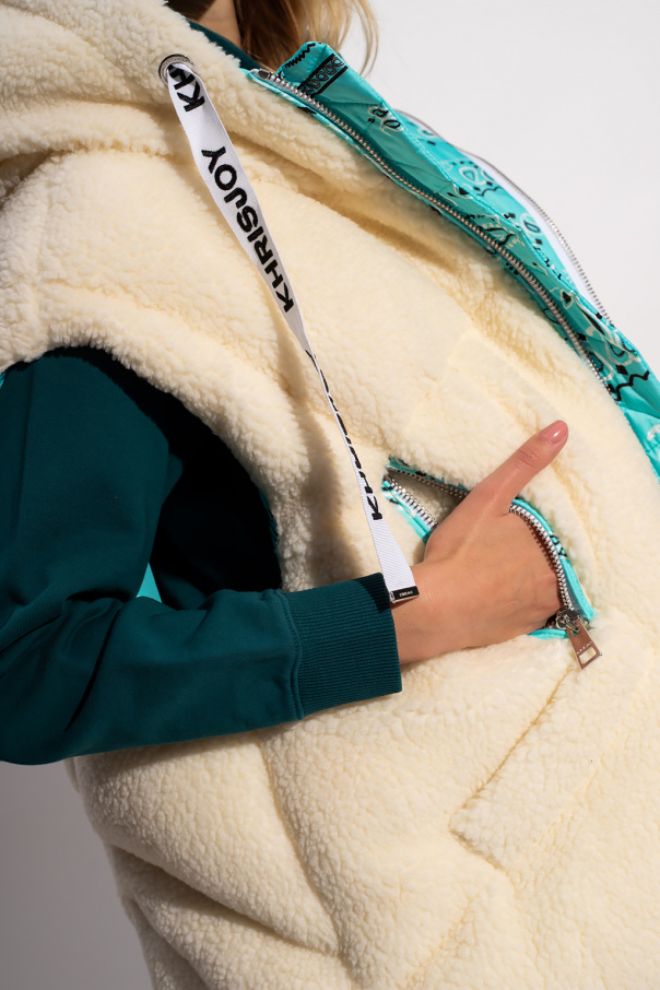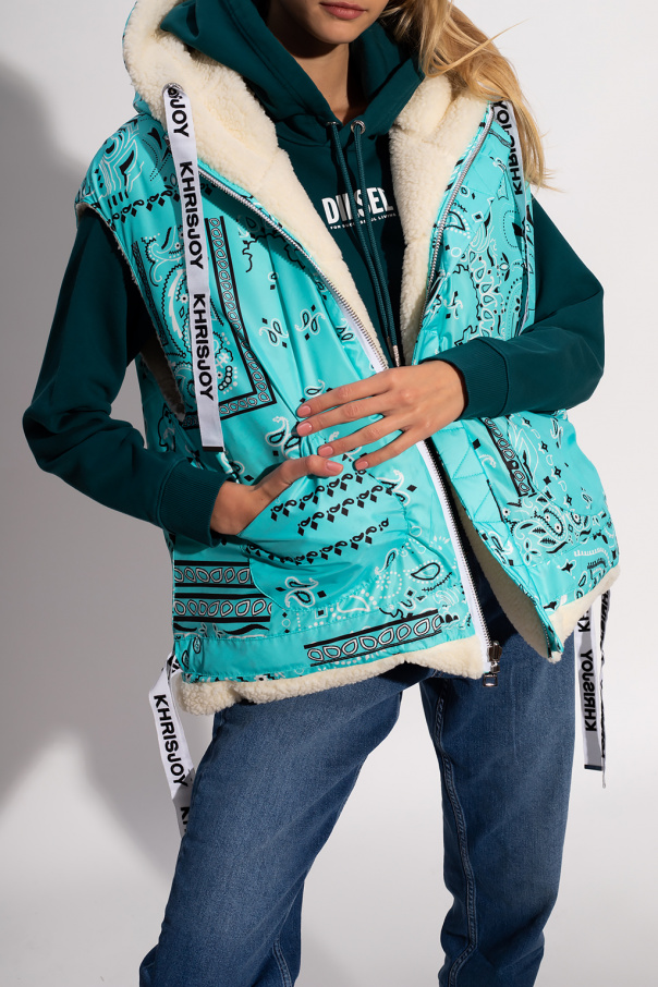 Cream and blue fur vest from Khrisjoy. Embellished with a paisley motif, this style fastens via a zip and features two slip pockets, two zipped pockets and black logo-printed drawstrings at the bottom hem and hood.